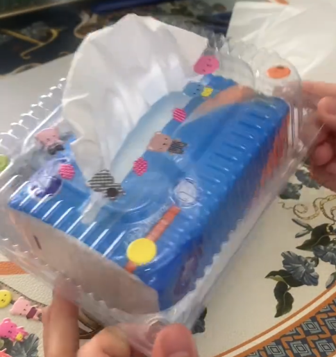 之后就可以把纸巾放进去,最上面的纸张可以从裁剪的小孔抽出来。