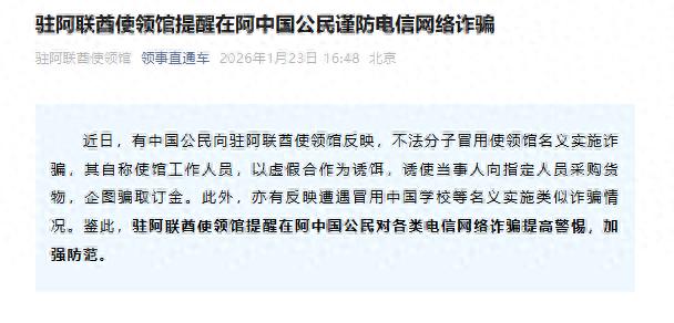 近日,有中国公民向驻阿联酋使领馆反映,不法分子冒用使领馆名义实施诈骗,其自称使馆工作人员,以虚假合作为诱饵,诱使当事人向指定人员采购货物,企图骗取订金。此外,亦有反映遭遇冒用中国学校等名义实施类似诈骗情况。鉴此,驻阿联酋使领馆提醒在阿中国公民对各类电信网络诈骗提高警惕,加强防范。