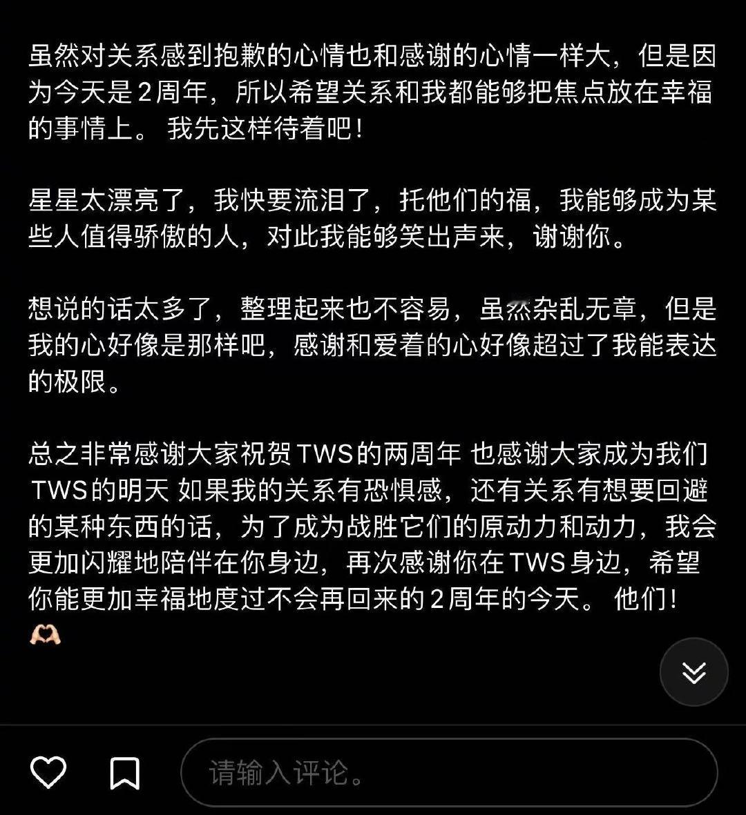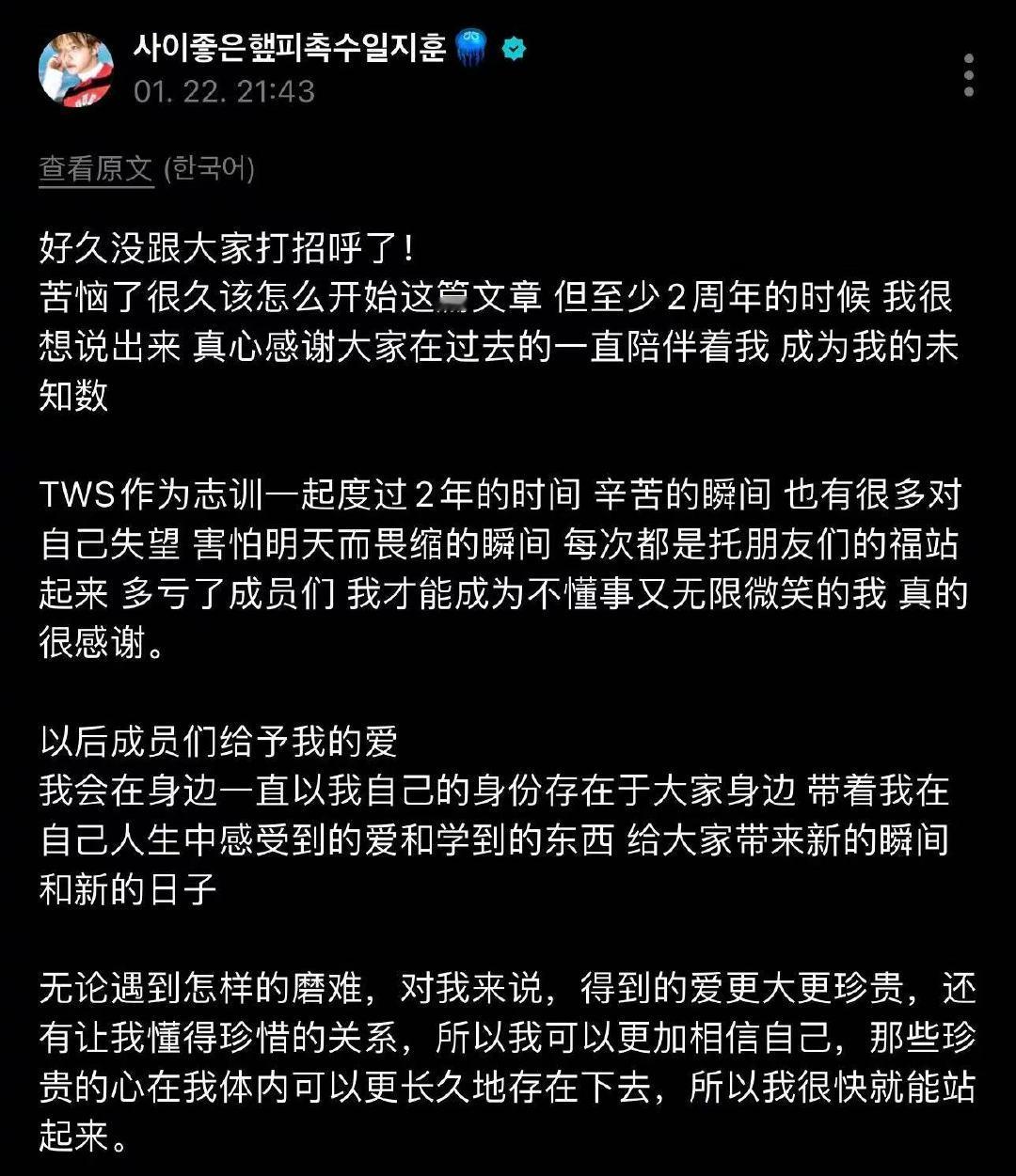 韩志薰发长文韩志薰父亲去世后首发文 TWS韩志薰昨晚深夜发长文,说“无论遇到怎样的磨难,对我来说,得到的爱更大更珍贵”,坚强的志薰以后一定会闪闪发光的