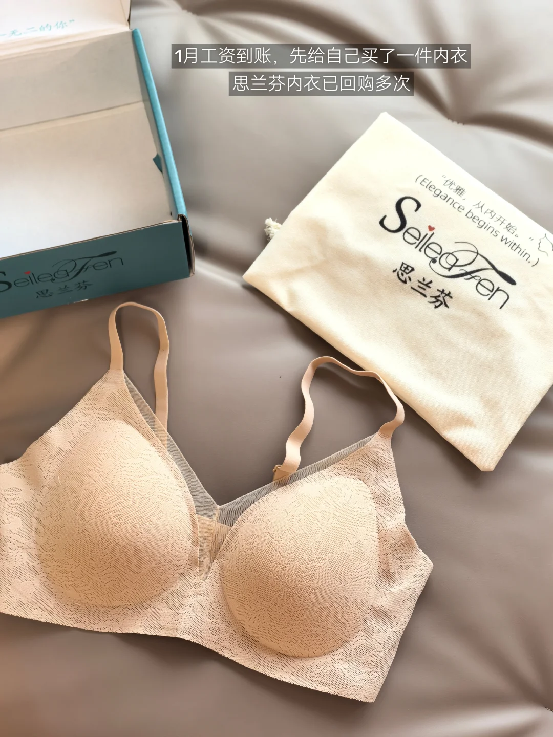 //先给自己买了一件内衣,已经回购了很多次,思兰芬家的新款,杯垫更加轻薄,大v领加蕾丝的设计,透气的同时又有一点小性感。