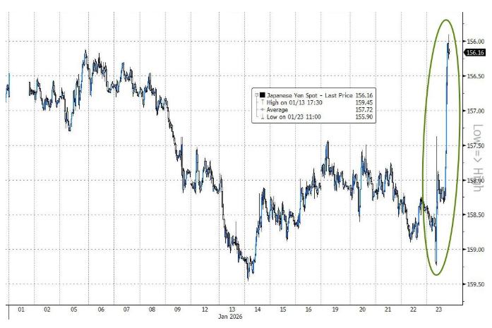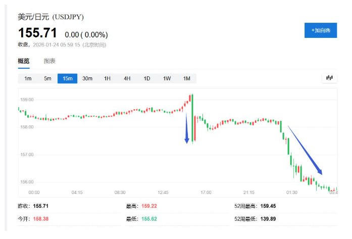 日元的第一波上涨出现在欧市早盘,美元兑日元此前在欧市盘初涨至159.23,自1月14日以来首次盘中涨破159.00,随后跳水转跌,约十分钟左右迅速跌破157.50、日内跌近0.6%,此后保持跌势。美股午盘时段,日元迎来第二波更为猛烈的拉升,抹平去年圣诞节以来跌幅,美元兑日元加速下跌至155.63,刷新去年12月24日以来低位。