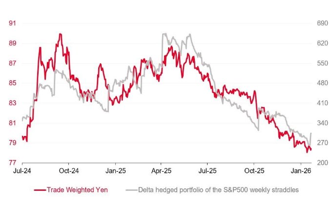 下图灰线代表买入标普500指数极短期波动率的回报,自2025年6月以来,这部分波动率的表现明显逊色。从这个角度看,若这种相关性持续,日元贸易加权汇率走强或许会成为引发更广泛股市避险情绪的重要催化剂。