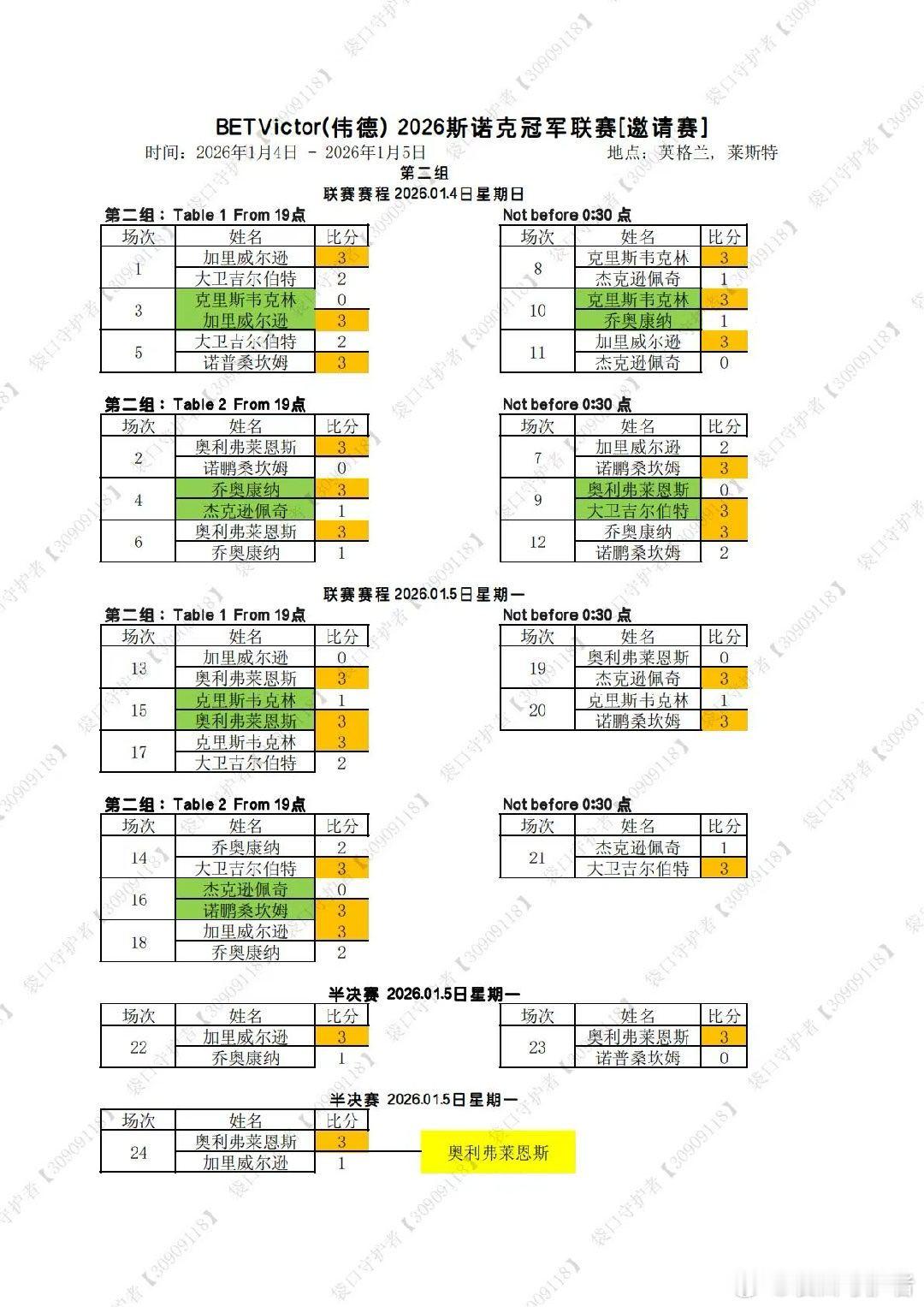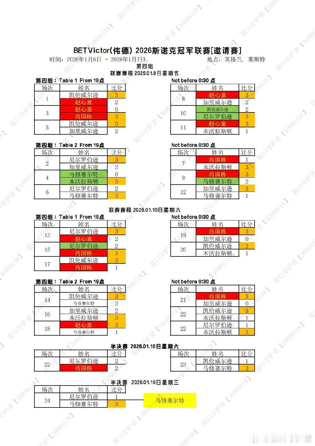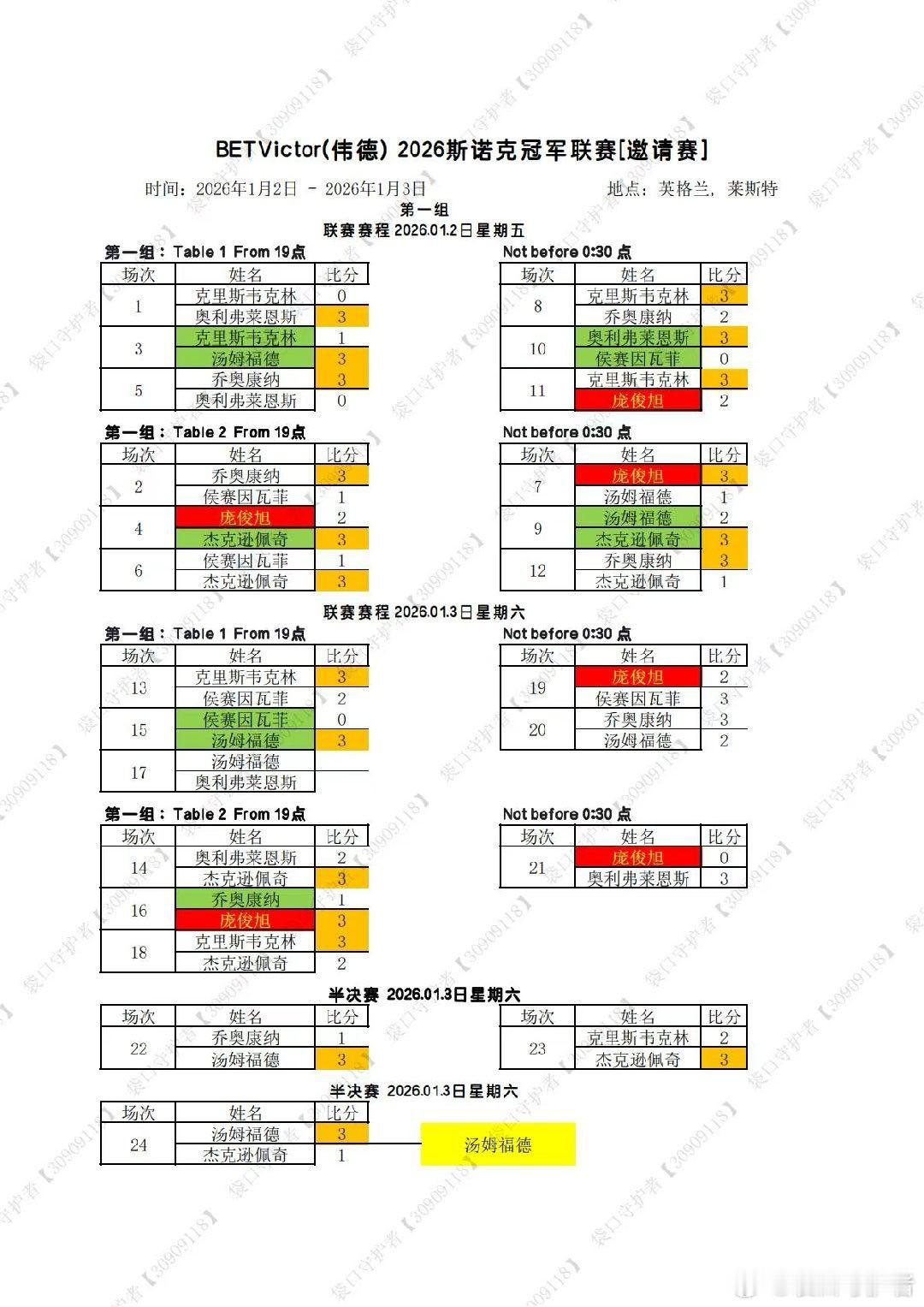 2026冠军联赛1-7组结束,胜者组2.10日开打,中国选手晋级胜者组的有斯佳辉,吴宜泽,张安达……