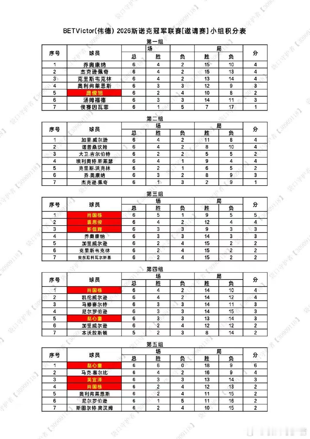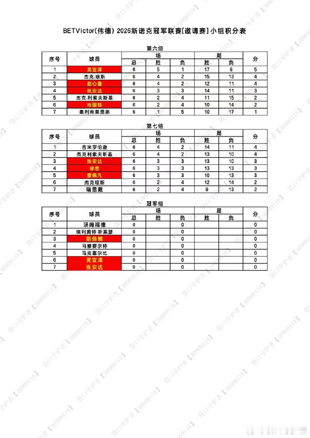2026冠军联赛1-7组结束,胜者组2.10日开打,中国选手晋级胜者组的有斯佳辉