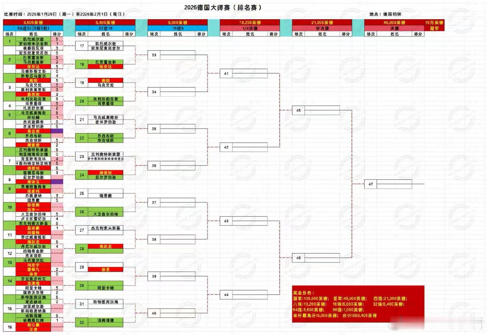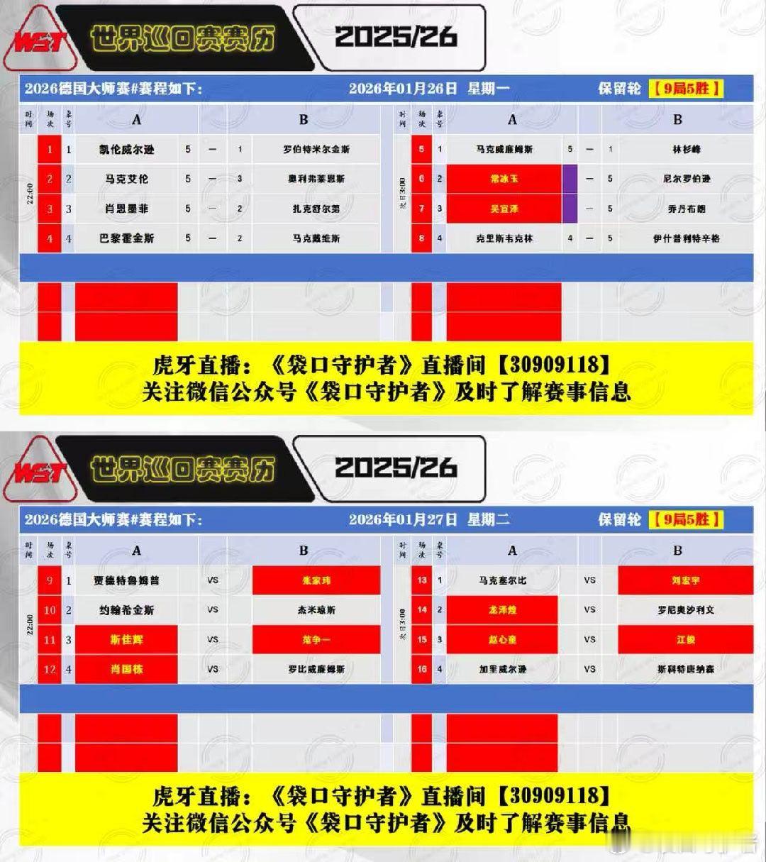 2026德国大师赛开赛2026.01.27人星期二17:00直播:斯佳辉(16)VS范争一(56)、肖国栋(11)VS罗比威廉姆斯(55)22:00 直播:赵心童(9)VS江俊(84)