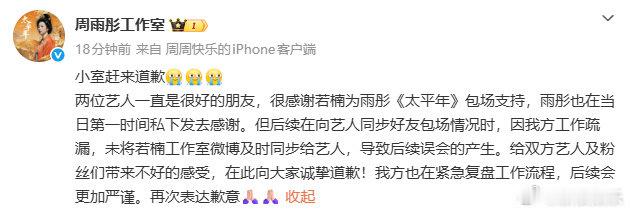 周雨彤回复了章若楠粉丝周雨彤工作室致歉 回复了其他为新剧《太平年》包场的艺人而遗漏了发文称周雨彤在第一时间就私下表示了感谢,“但后续在向艺人同步好友包场情况时,因我方工作疏漏,未将若楠工作室微博及时同步给艺人”,对此致歉。