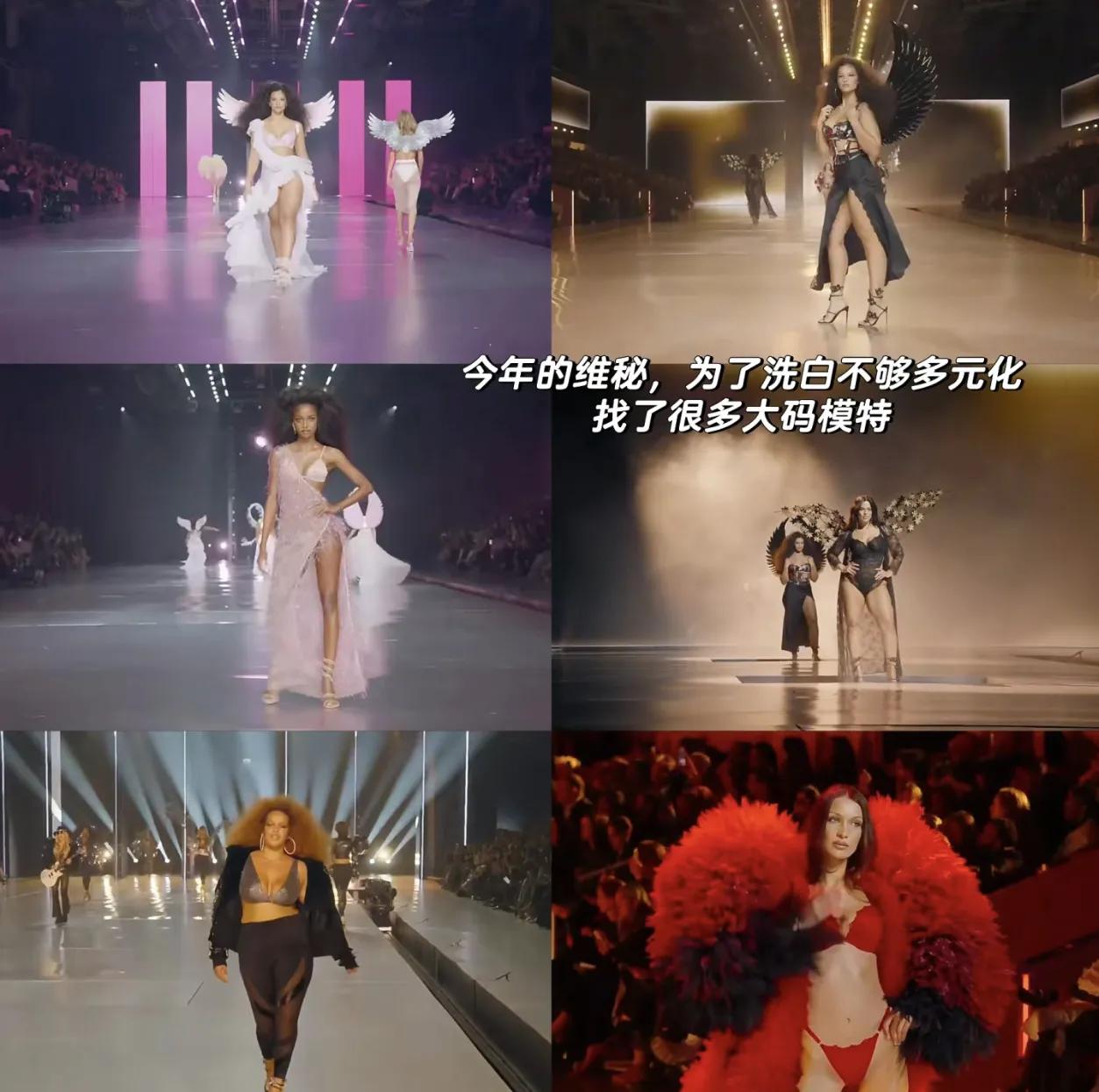 不过,该说不说,今年的维密秀还是有点进步的。虽然舞台是失望的,但审美不是狭隘的了。内衣回归本质了,胖瘦都是自信的美。