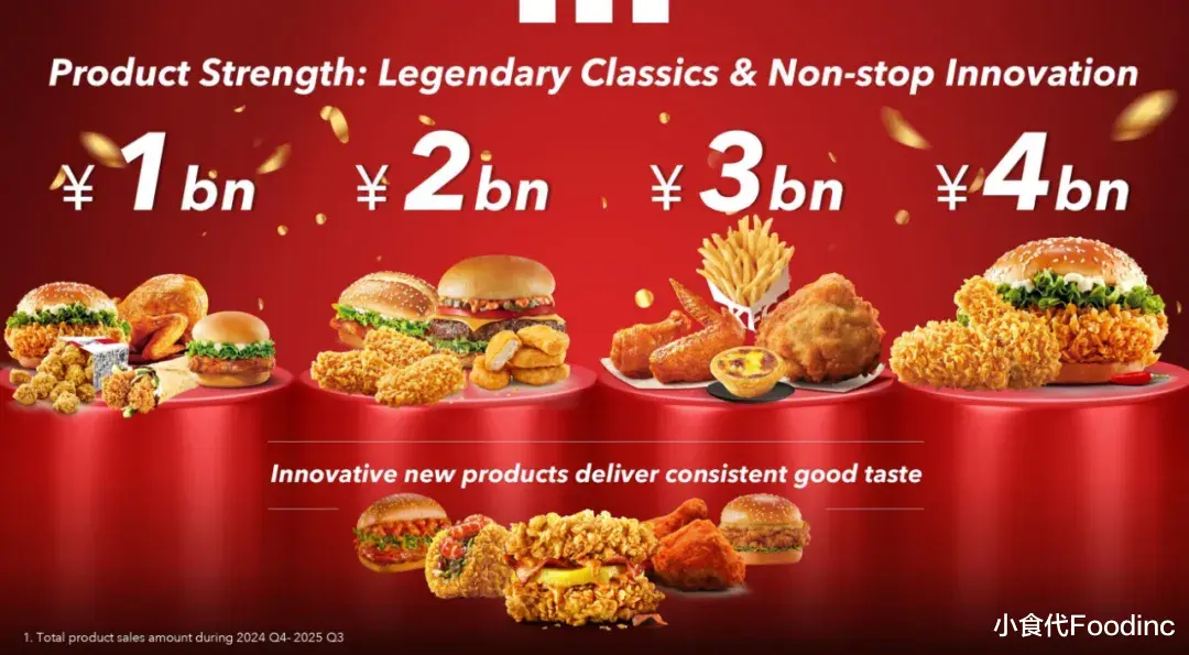 根据小食代翻查的百胜中国投资者日会议资料显示,2025年,肯德基前六大单品的年度销售额预计可超220亿元,贡献品牌30%销售额。其中,香辣鸡翅和香辣鸡腿堡的年度单品销售额均已超过40亿元,而蛋挞的身影则出现在了“30亿元级大单品”的阵营中。