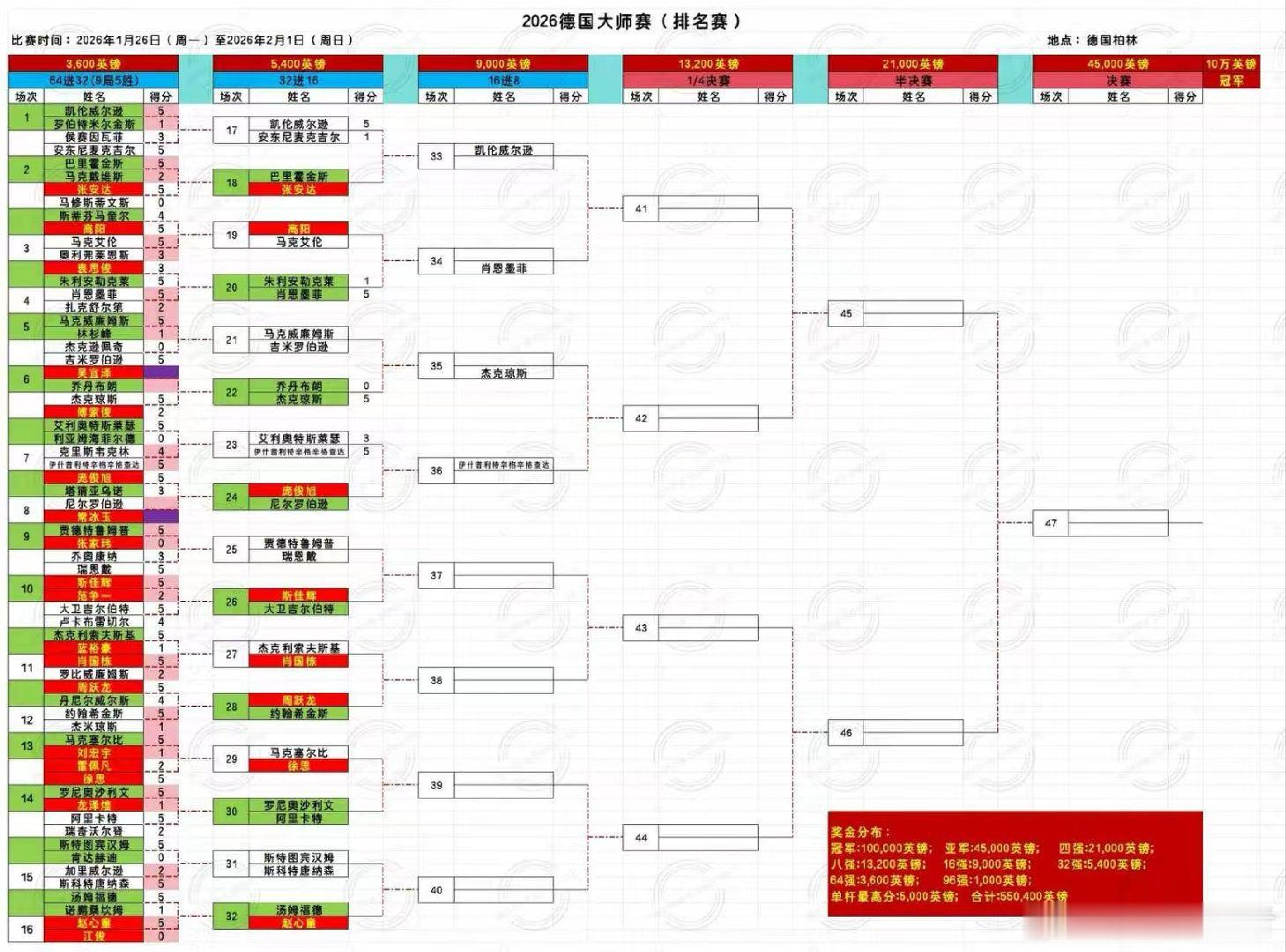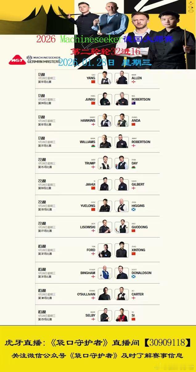 2026德国大师赛第三天2026.01.28日 星期三17:00直播:高阳(105)VS马克艾伦(10)22:00 直播:斯佳辉(16)VS大卫吉尔伯特(24)2026.01.29日 星期四3:00 直播:赵心童(9)VS汤姆福德(28)