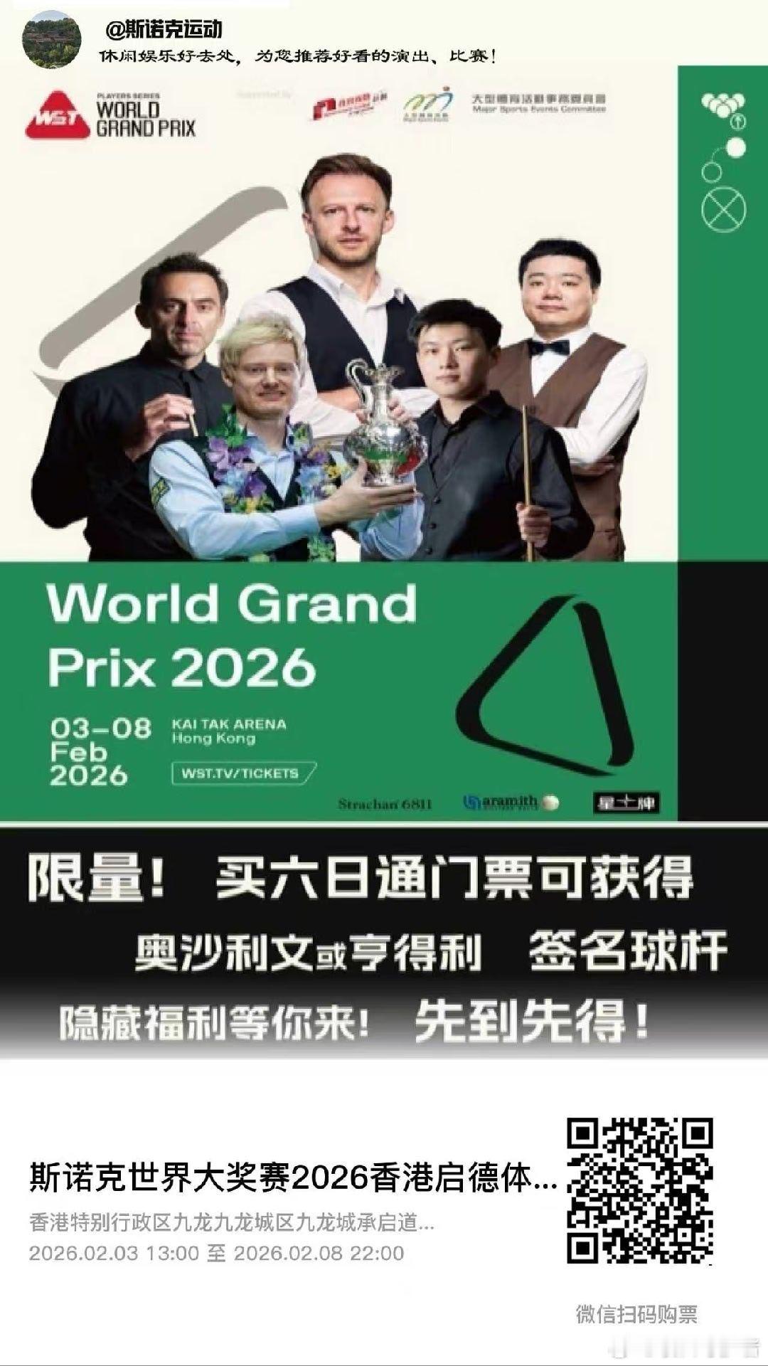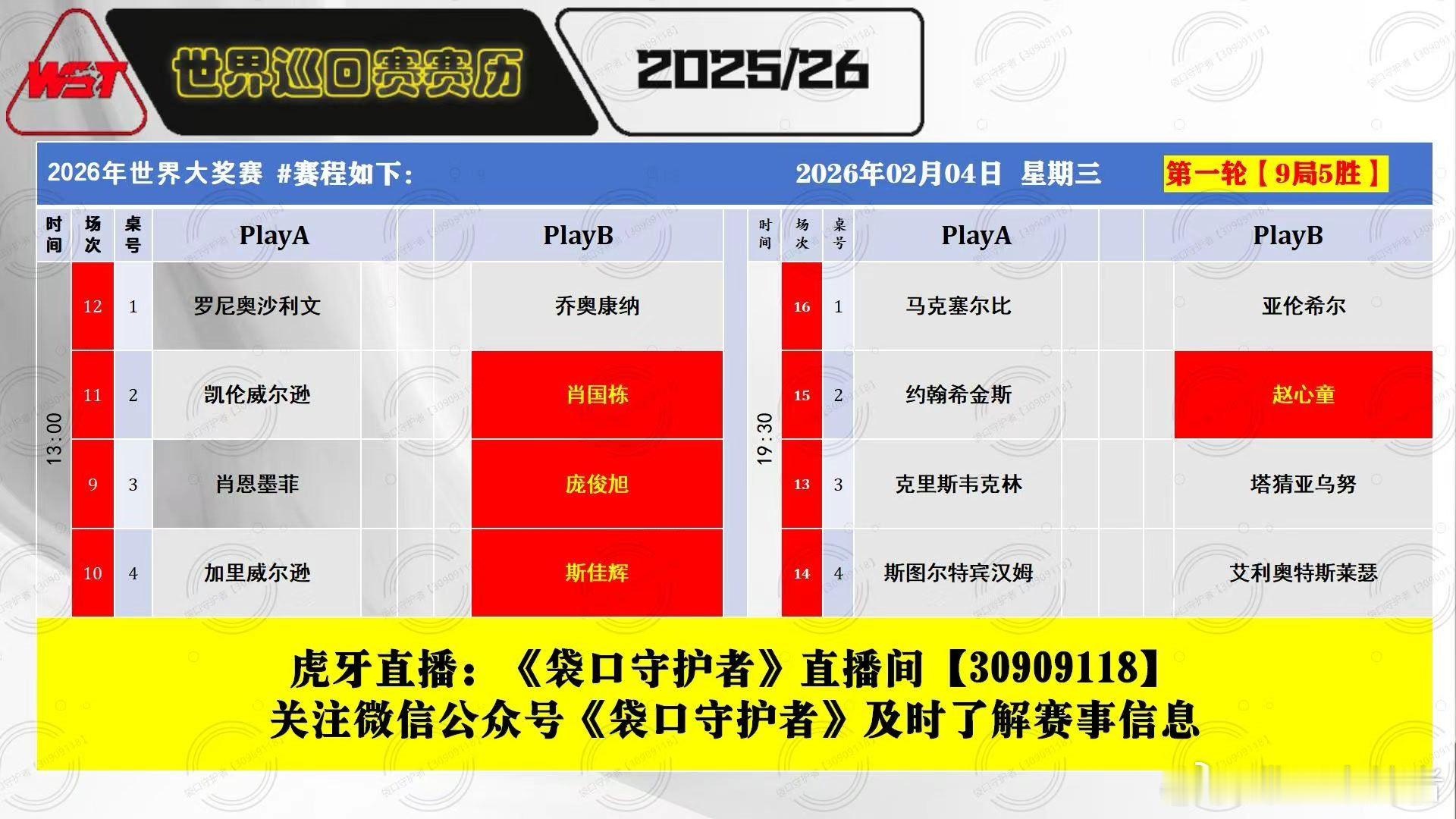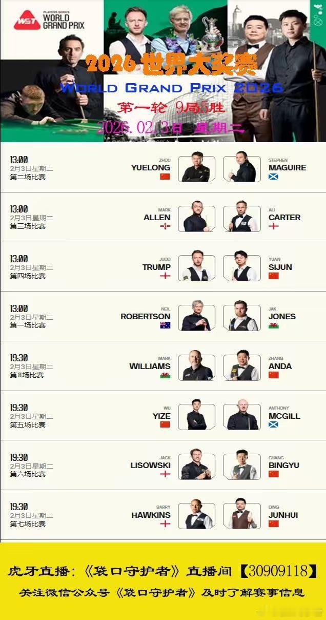 2026斯诺克世界大奖赛开幕2026.2.3日 星期二 第一天 第一轮 9局5胜13:00 直播: 周跃龙VS斯蒂芬马奎尔19:00 直播: 吴宜泽VS安东尼麦克吉尔 常冰玉VS杰克利索夫斯基