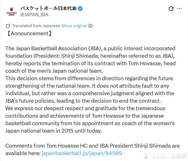 日本篮协宣布中止与日本男篮主教练汤姆·霍瓦斯的合同。