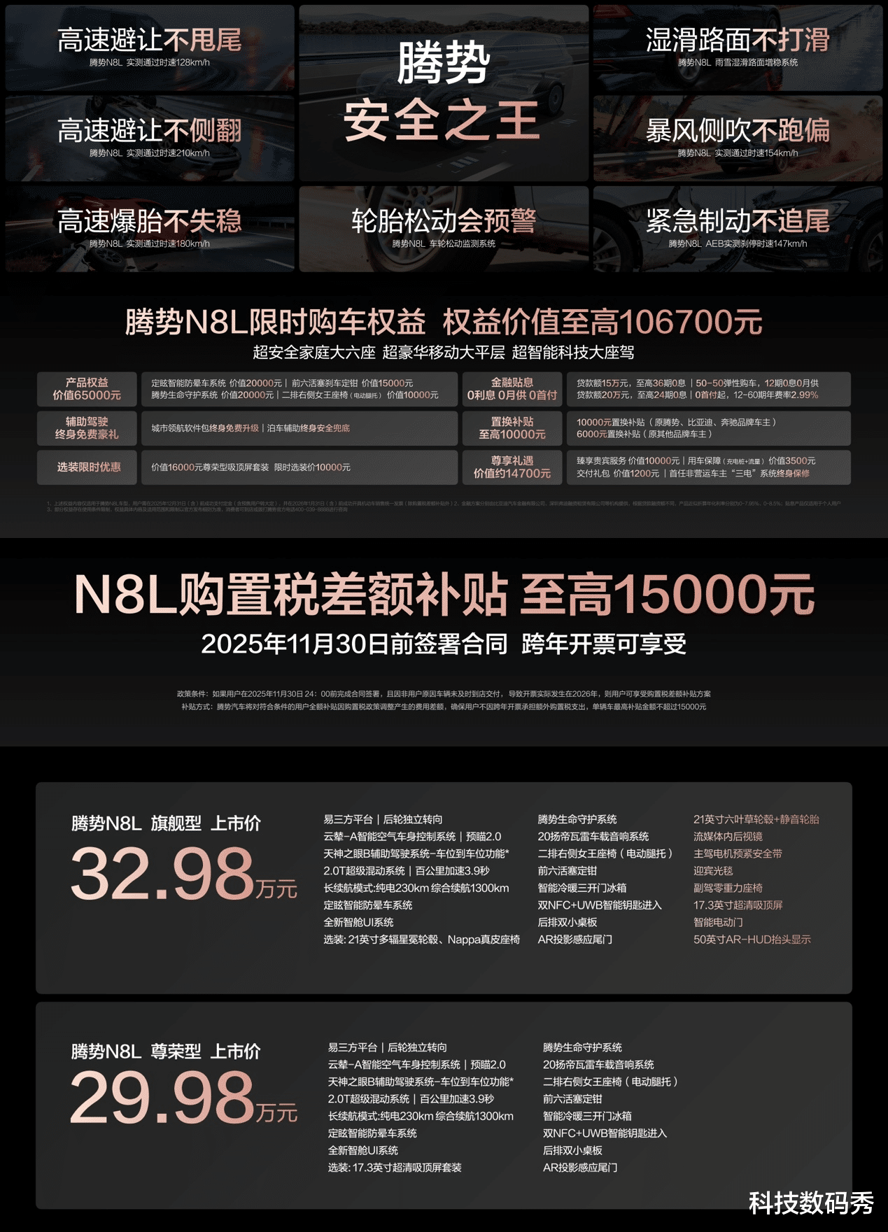 前有腾势N9,如今比亚迪28号又上市腾势N8L,绝杀20-40万价格区间的所有大六座豪华SUV,比亚迪现在真的是卷王本王了,车身尺寸、空间都超越同级,六座电动座椅还能一键切换多场景,灵活布局,适配多元家庭需求。动力方面插混专用2.0T发动机+三电机,零百加速3.9秒,后轮独立转向,4.58米超小转弯半径,各种数据和新功能都很亮眼。