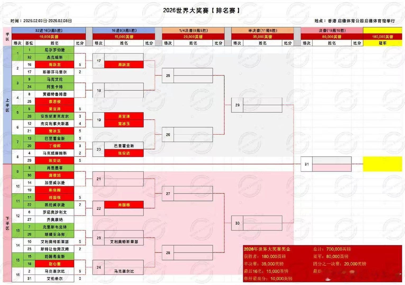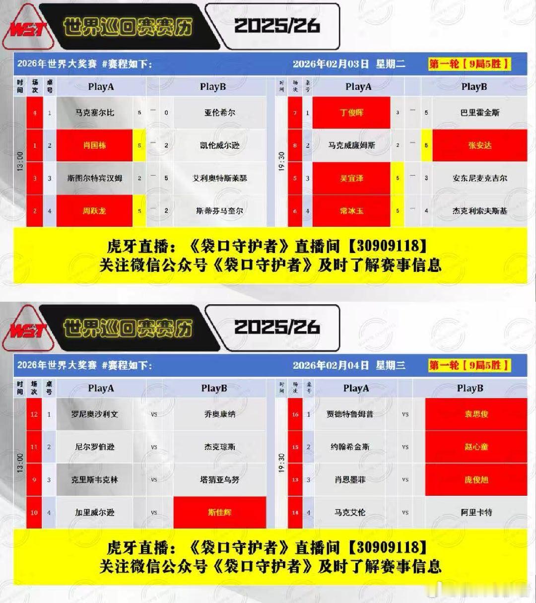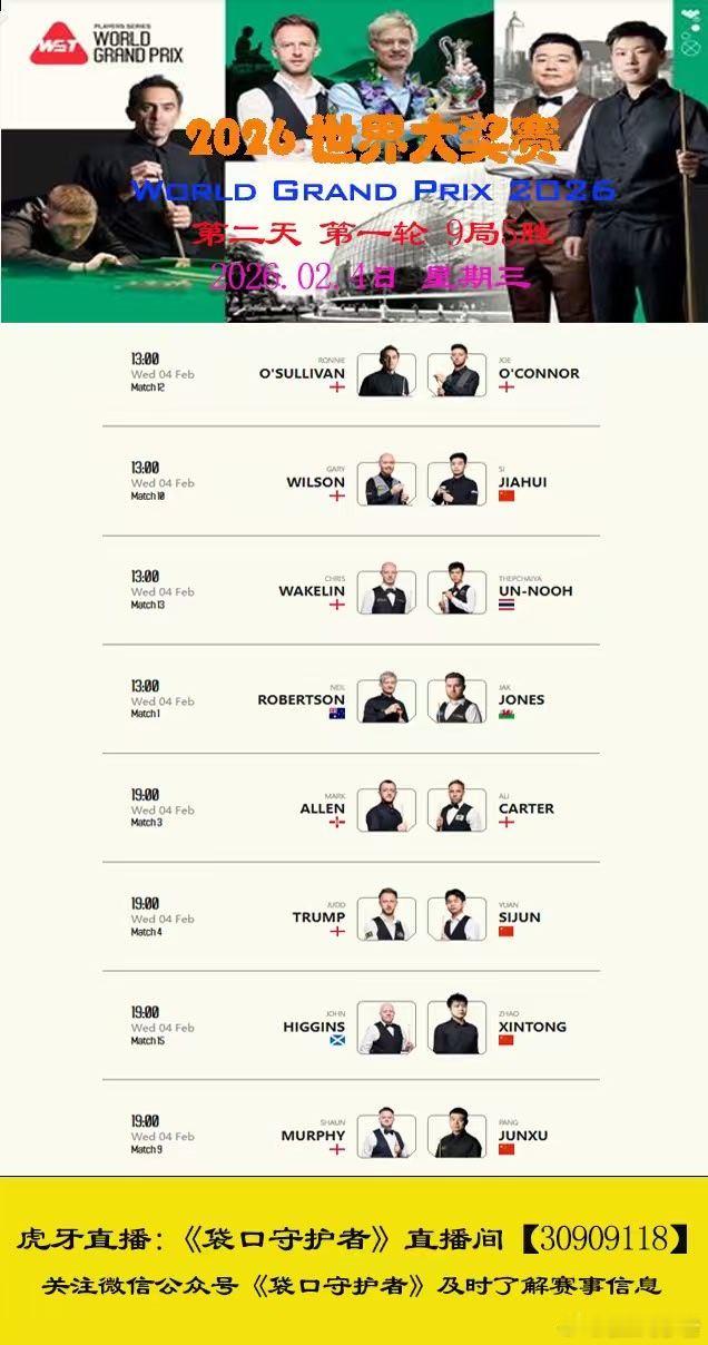 2026斯诺克(香港)世界大奖赛 第二天 第二天2026.02.04日 星期三13:00 直播 斯佳辉VS加里威尔逊19:00直播 赵心童VS约翰希金斯