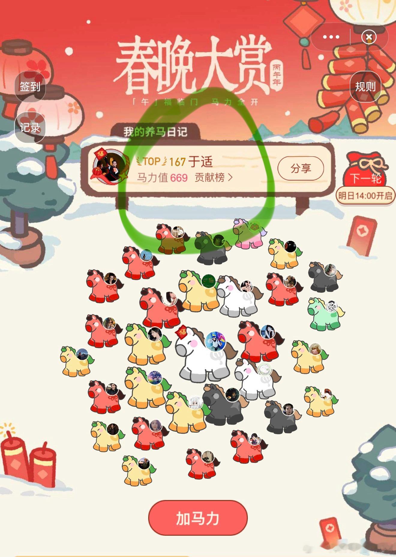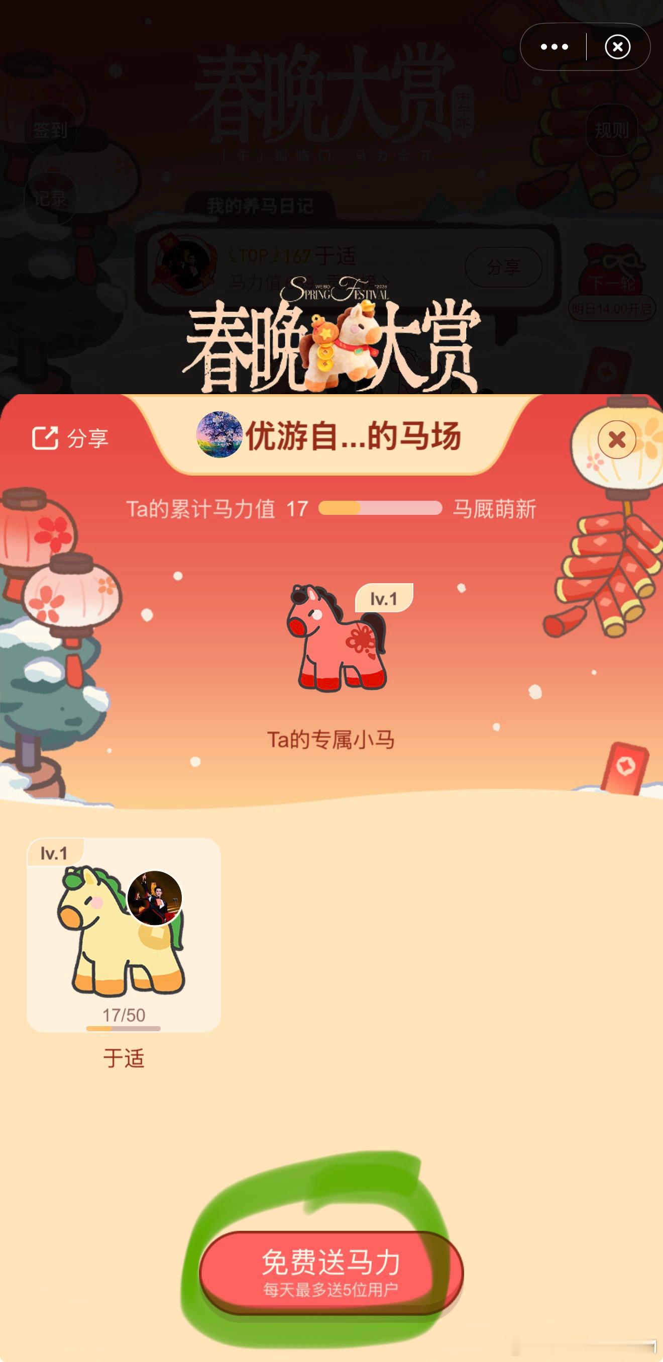 于适yosh 领养于适的小马送马力来看,贡献榜里去串门每天可以送五人5马力值,