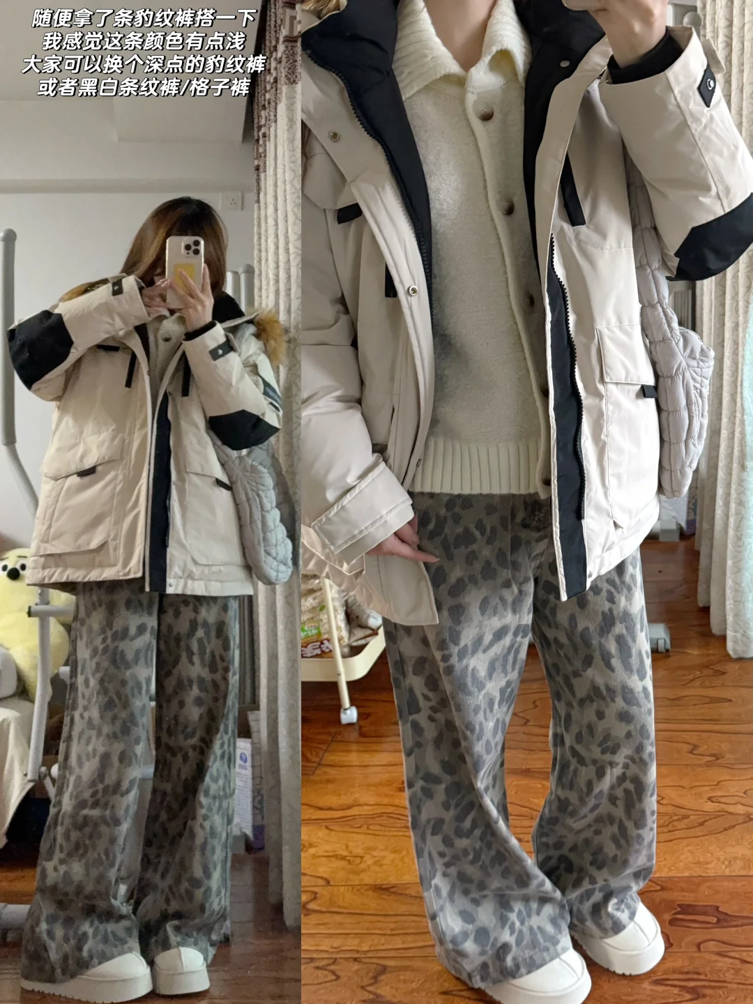👉🏻米白色派克服➕黑白条纹裤/豹纹裤/格子裤➕勃肯鞋/雪地靴(更随意一些 出门遛弯一套就很方便)