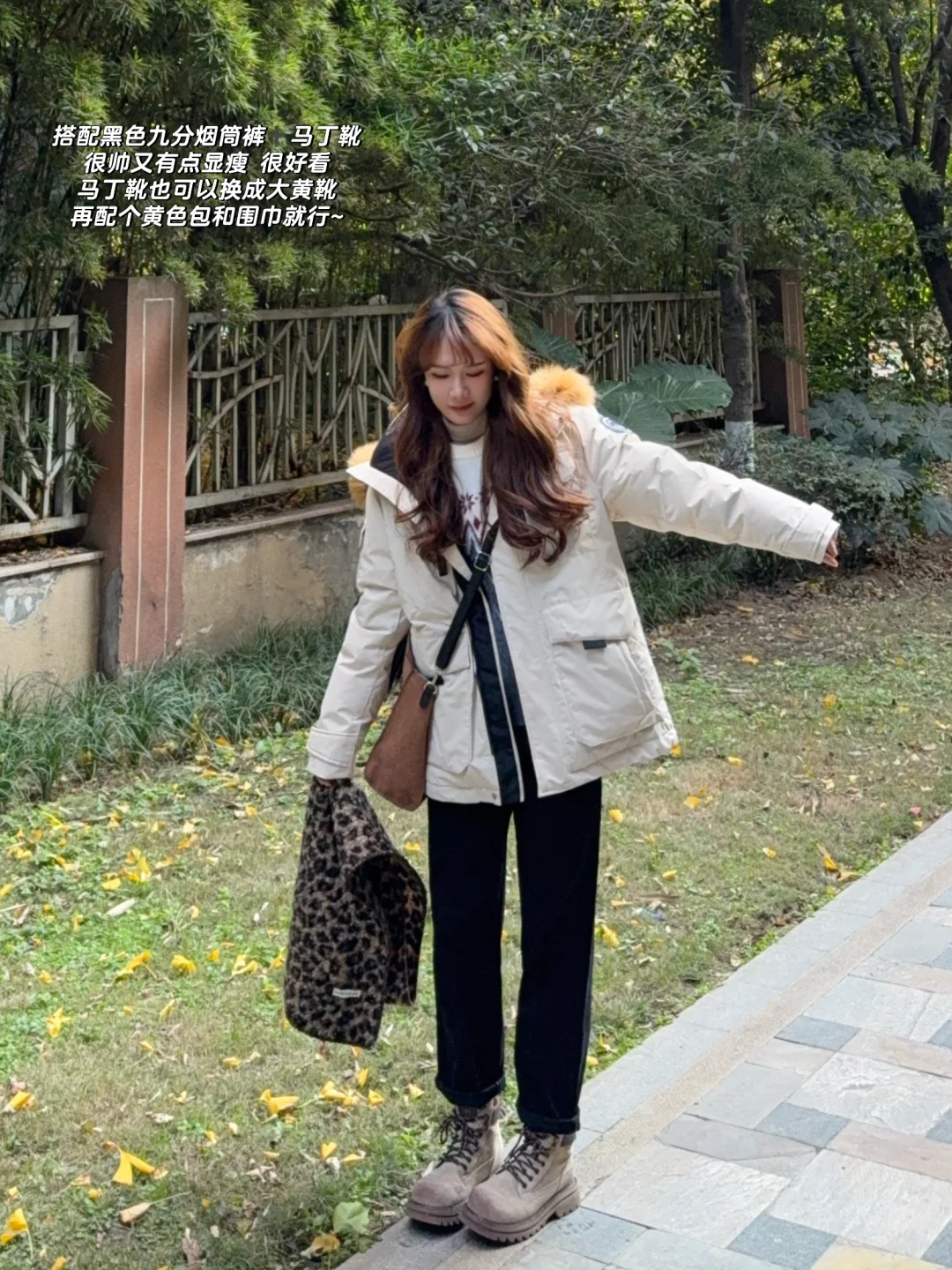 👉🏻米白色派克服➕黑色/棕色牛仔九分裤/烟筒裤➕高筒靴/大黄靴/马丁靴(比较利索显瘦显高)