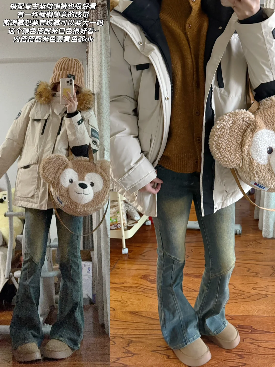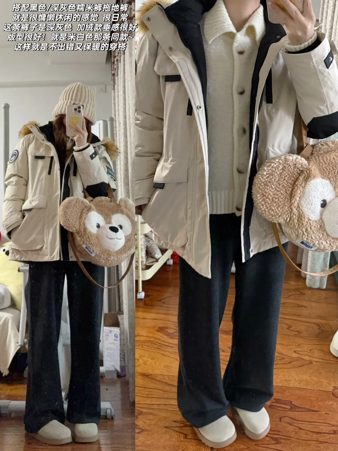 👉🏻米白色派克服➕拖地裤/微喇裤/糯米裤➕厚底雪地靴/运动鞋(比较慵懒休闲 很舒适)