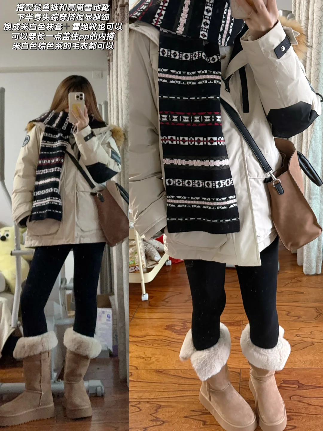 👉🏻米白色派克服➕长内搭➕黑色鲨鱼裤➕米色袜套/雪地靴或者高筒的雪地靴(时髦搭配 腿不细的姐妹更建议搭配长一点宽松的袜套➕厚底雪地靴更显瘦)