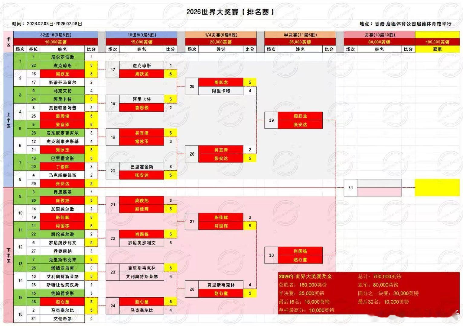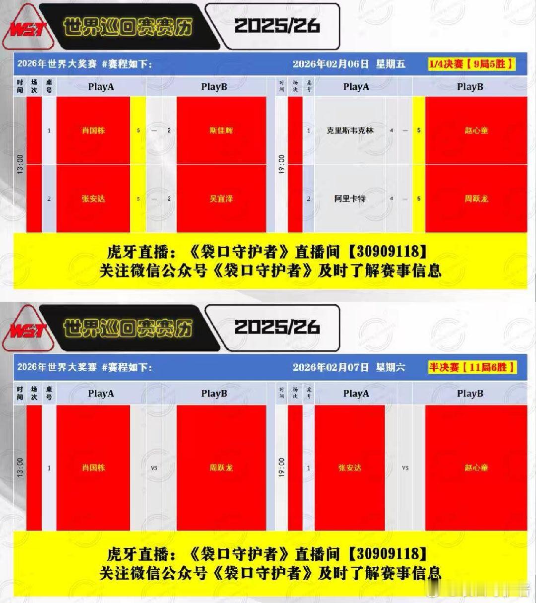 2026斯诺克(香港)世界大奖赛 半决赛 第五天中国选手周跃龙、张安达、肖国栋、赵心童四人包揽四强,创新历史2026.02.07日 星期六13:00 直播 周跃龙VS张安达19:00 直播 赵心童VS肖国栋