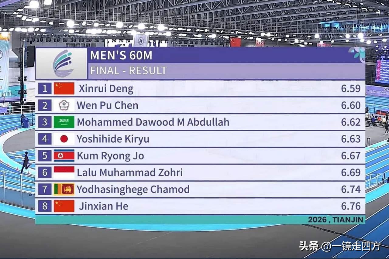 在天津进行的亚洲室内田径锦标赛男子60米决赛,中国选手邓信锐以6秒59惊险夺冠,仅领先亚军选手中国台北的陈玟溥0.01秒,后者也创造了台湾省新纪录,这是中国队时隔20年重夺该项目亚洲冠军,也是22岁的广西选手邓信锐的首个亚洲冠军。 邓信锐在半决赛跑出6秒56的个人最好成绩,将去年在成都室内大奖赛跑出的6秒57的PB提升了0.01秒,成功达标室内世锦赛,另一名中国选手何锦櫶以6秒76获得第八名,来势汹汹的日本名将桐生祥秀以6秒63获得第四名,无缘领奖台。 这也是中国队首日拿到的第三金,粟文、焦新评和马英龙包揽男子三级跳远前三名,宋佳媛、姜月和孙悦包揽女子铅球前三名。当天还决出另外三枚金牌,日本选手濑古优斗以2米23收获男子跳高冠军,日本的田中希实以4分19秒15夺得女子1500米冠军,全运会冠军李春辉获得亚军,哈萨克斯坦选手奇斯佳科娃摘得女子五项全能项目金牌。