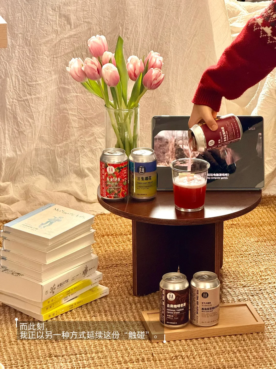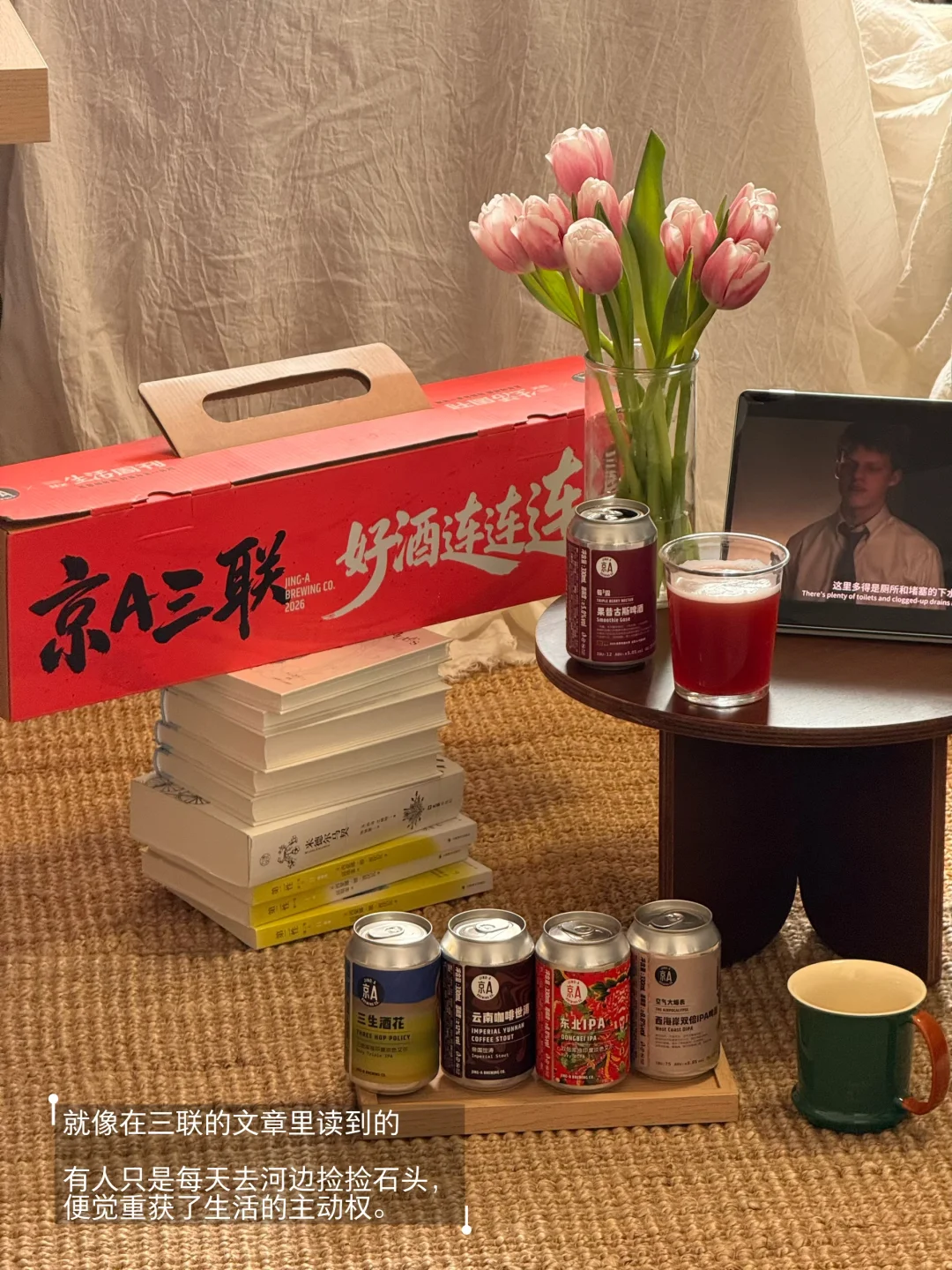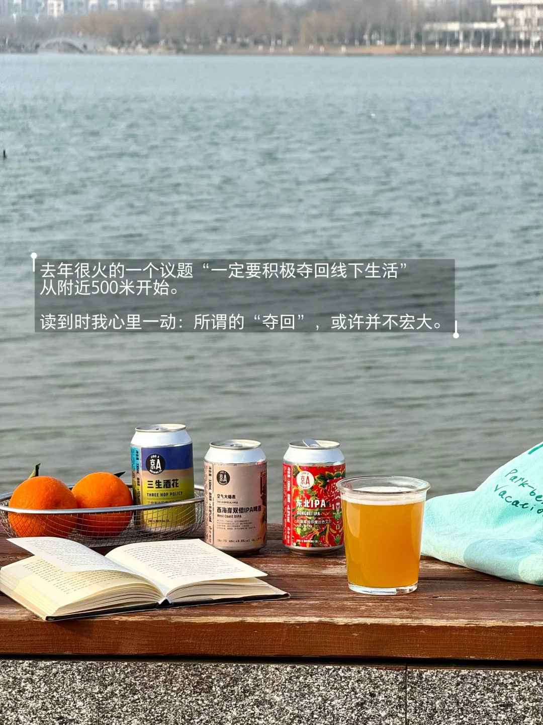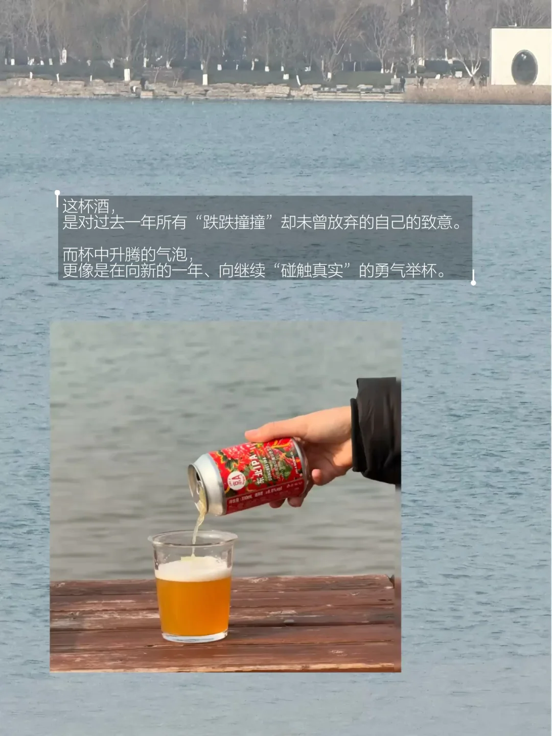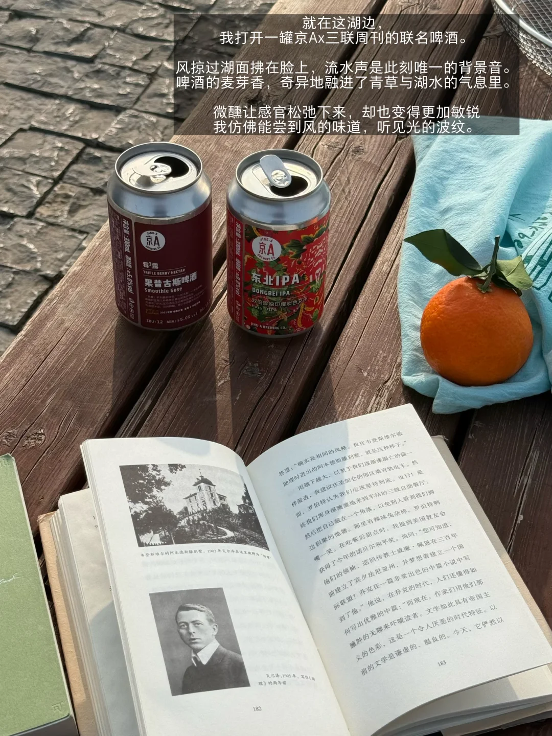 就在这湖边,我打开一罐京A×三联周刊的联名啤酒。风掠过湖面拂在脸上,流水声是此刻唯一的背景音。啤酒的麦芽香,奇异地融进了青草与湖水的气息里。微醺让感官松弛下来,却也变得更加敏锐——我仿佛能尝到风的味道,听见光的波纹。