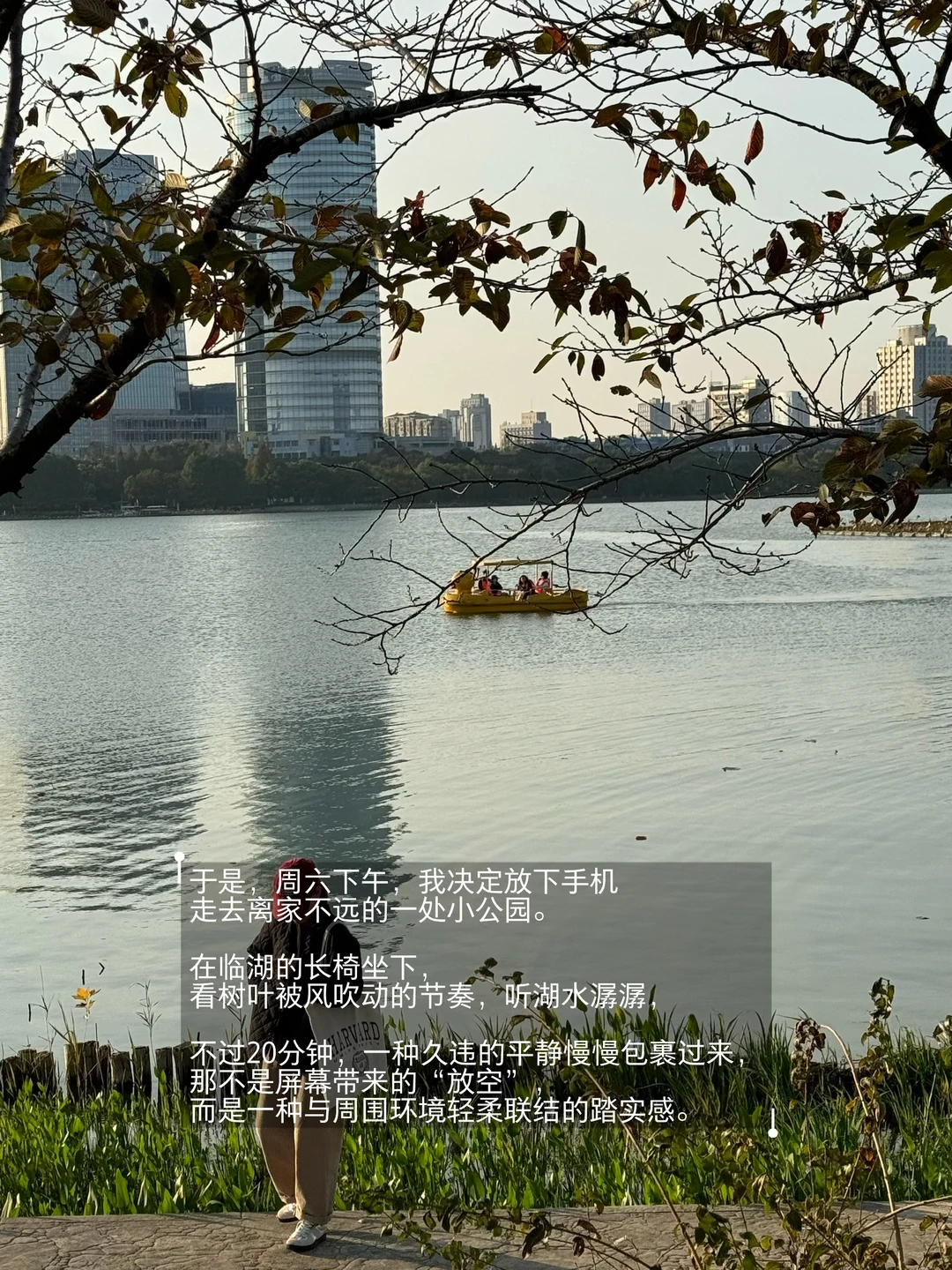 于是,周六下午,我决定放下手机,走去离家不远的一处小公园。在临湖的长椅坐下,看树叶被风吹动的节奏,听湖水潺潺,不过20分钟,一种久违的平静慢慢包裹过来,那不是屏幕带来的“放空”,而是一种与周围环境轻柔联结的踏实感。
