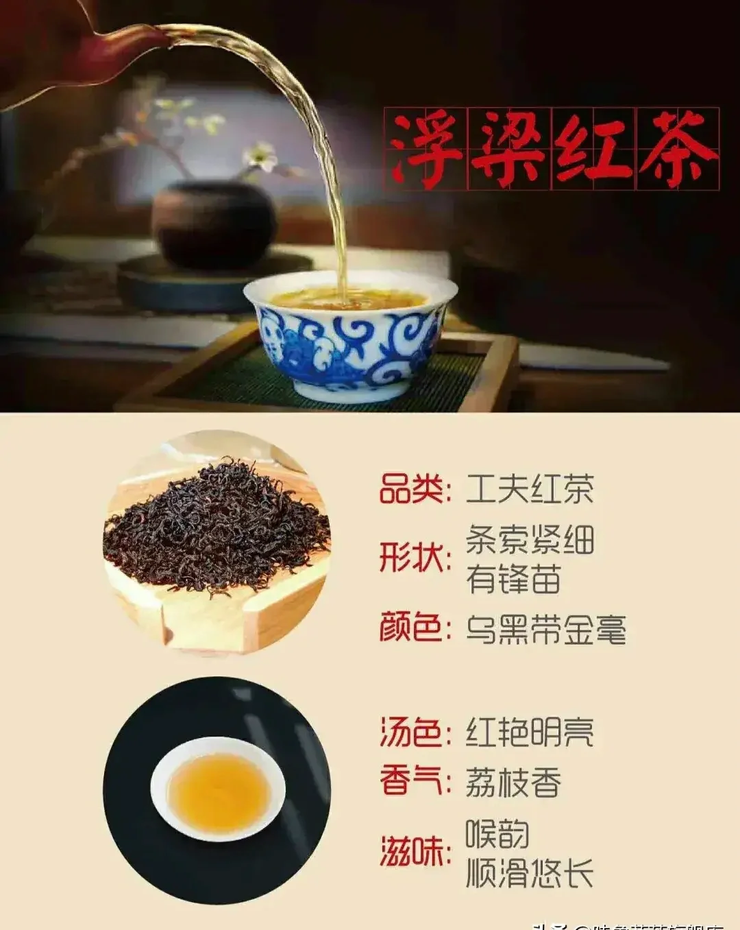 2浮梁红茶,品类:工夫红茶,形状:条索紧细,有锋苗颜色:乌黑带金毫,汤色:红艳明亮香气:荔枝香,滋味:喉韵顺滑悠长