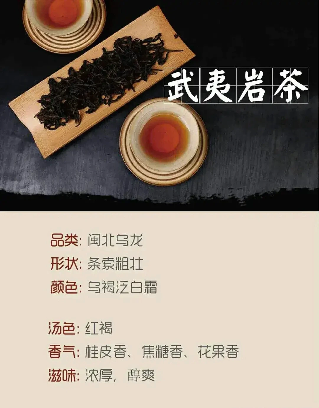 1.武夷岩茶,品类:闽北乌龙,形状:条索粗壮,颜色:乌褐泛白霜,汤色:红褐.香气:桂皮香,焦糖香,花果香滋味:浓厚,醇爽