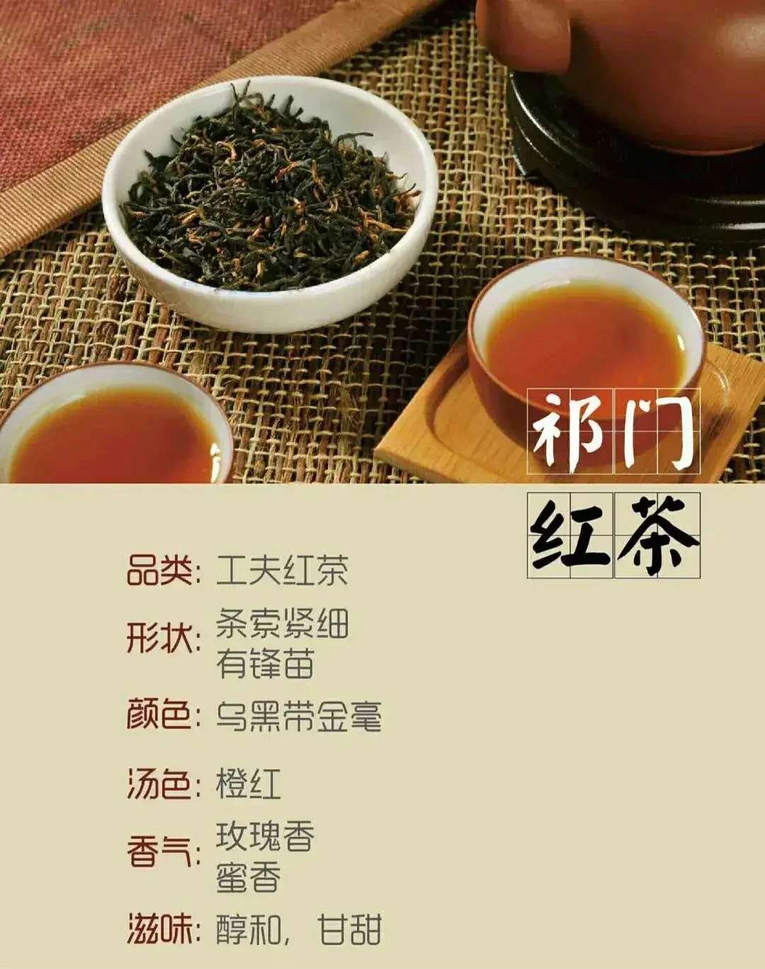 4.祁门红茶,品类:工夫红茶,形状:条索紧细,有锋苗颜色:乌黑带金毫汤色:橙红,香气:玫瑰香,蜜香滋味:浓醇,鲜爽.