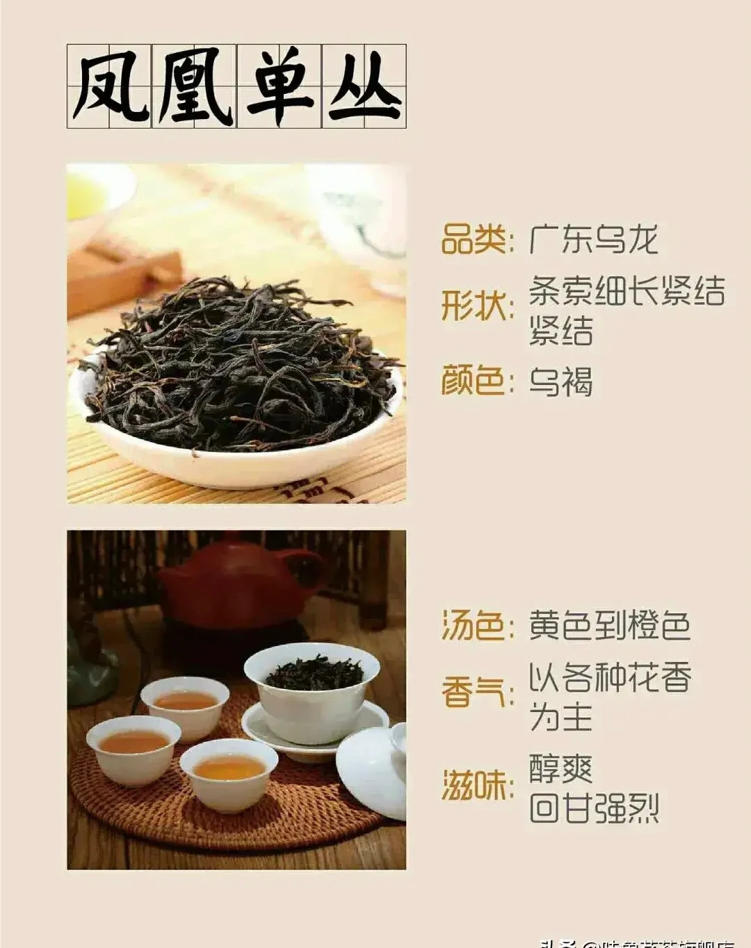 5.凤凰单丛,品类:广东乌龙,形状:条索细长紧结颜色:乌褐.汤色:黄色到橙色香气:以各种花香为主滋味:醇爽,回甘强烈。