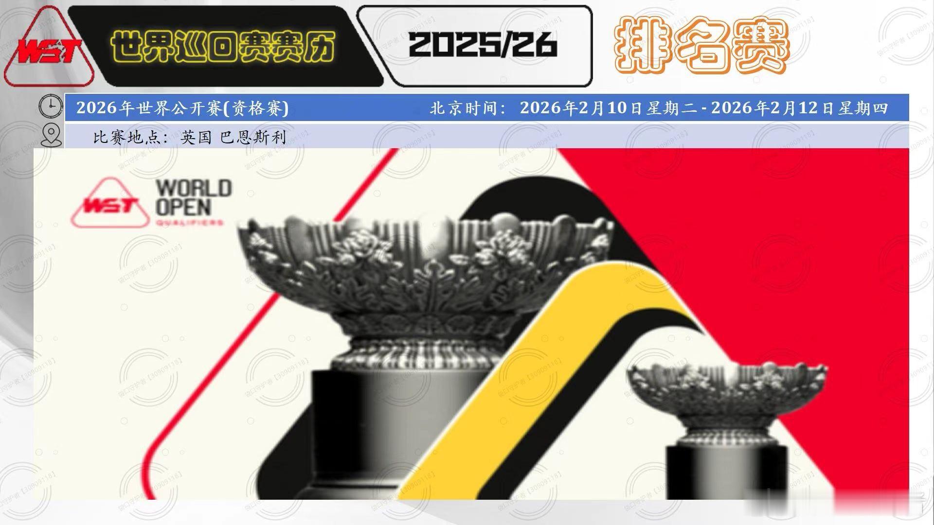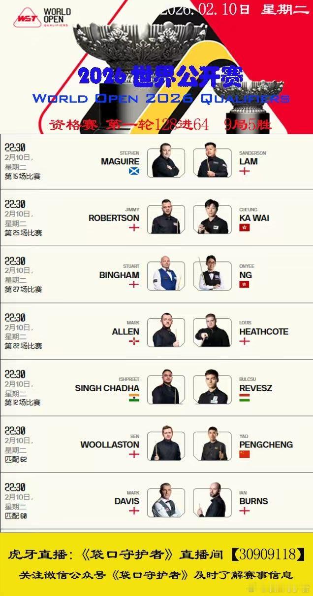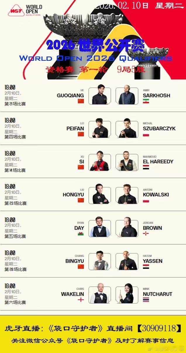 2026斯诺克世界公开赛资格赛 第一天2026.02.10日 星期二18:00 直播 常冰玉VS哈特姆·亚辛 小窗:雷佩凡VS米哈乌·苏巴尔奇克22:30 直播:姚朋成VS本·沃拉斯顿 小窗:吴安仪VS斯图尔特·宾汉姆