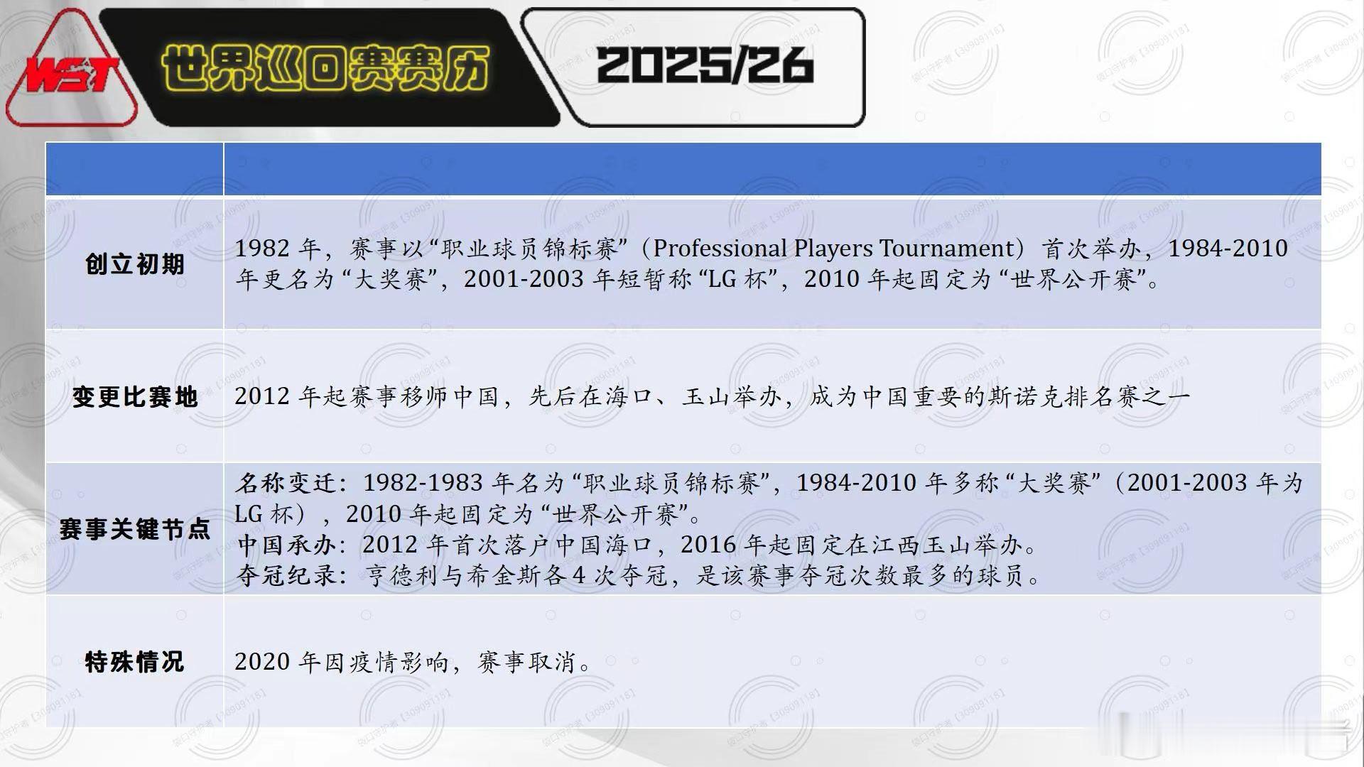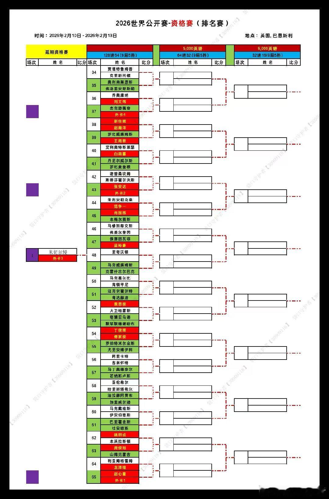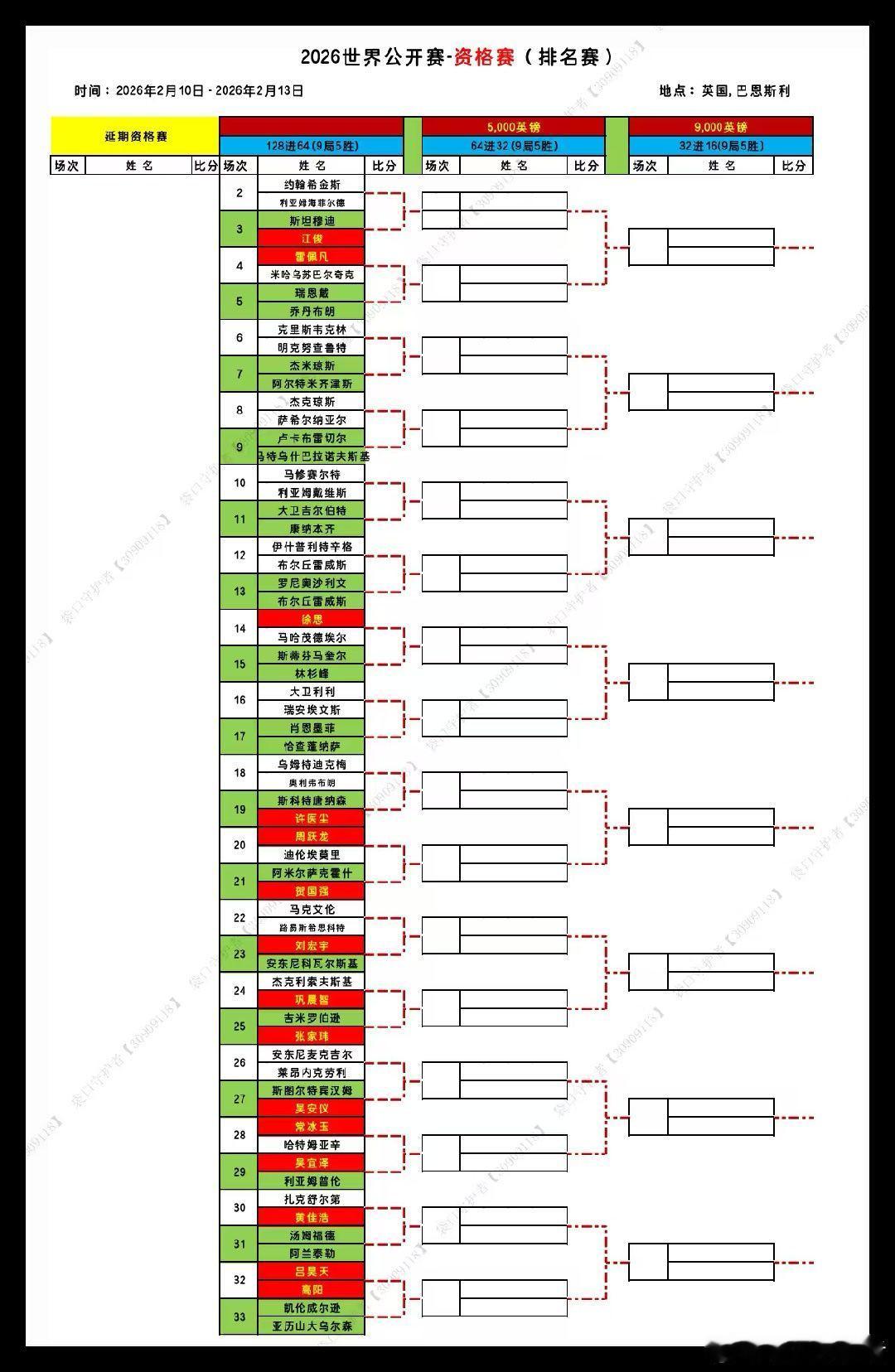2026斯诺克世界公开赛资格赛 第一天2026.02.10日 星期二18:00 直播 常冰玉VS哈特姆·亚辛 小窗:雷佩凡VS米哈乌·苏巴尔奇克22:30 直播:姚朋成VS本·沃拉斯顿 小窗:吴安仪VS斯图尔特·宾汉姆