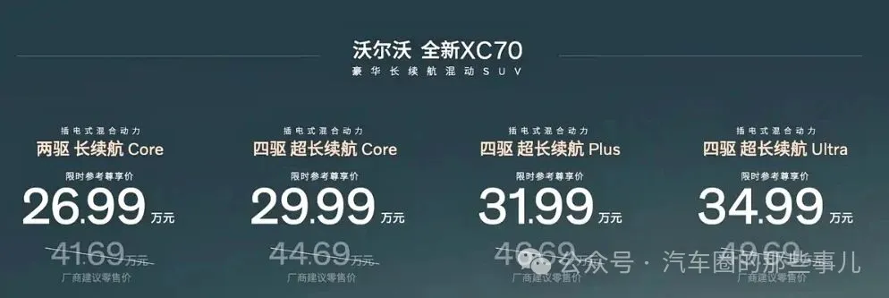 9月26日,沃尔沃全新XC70正式上市。新车共推出4款车型,指导价区间X26.99-34.99万元。新车是沃尔沃品牌基于SMA超级混动架构打造的首款SUV,在外观上采用最新的沃尔沃新能源家族式设计,内饰则做了颠覆性的重新设计,中控屏幕变为了横向布置;空间方面为2+3五座布局,动力方面搭载1.5T发动机与电机组成的插电混动系统,采用的是P1+P2+P4电机的构型,传动系统也配备;额全新的3挡DHT变速箱,并提供两驱和四驱版本。