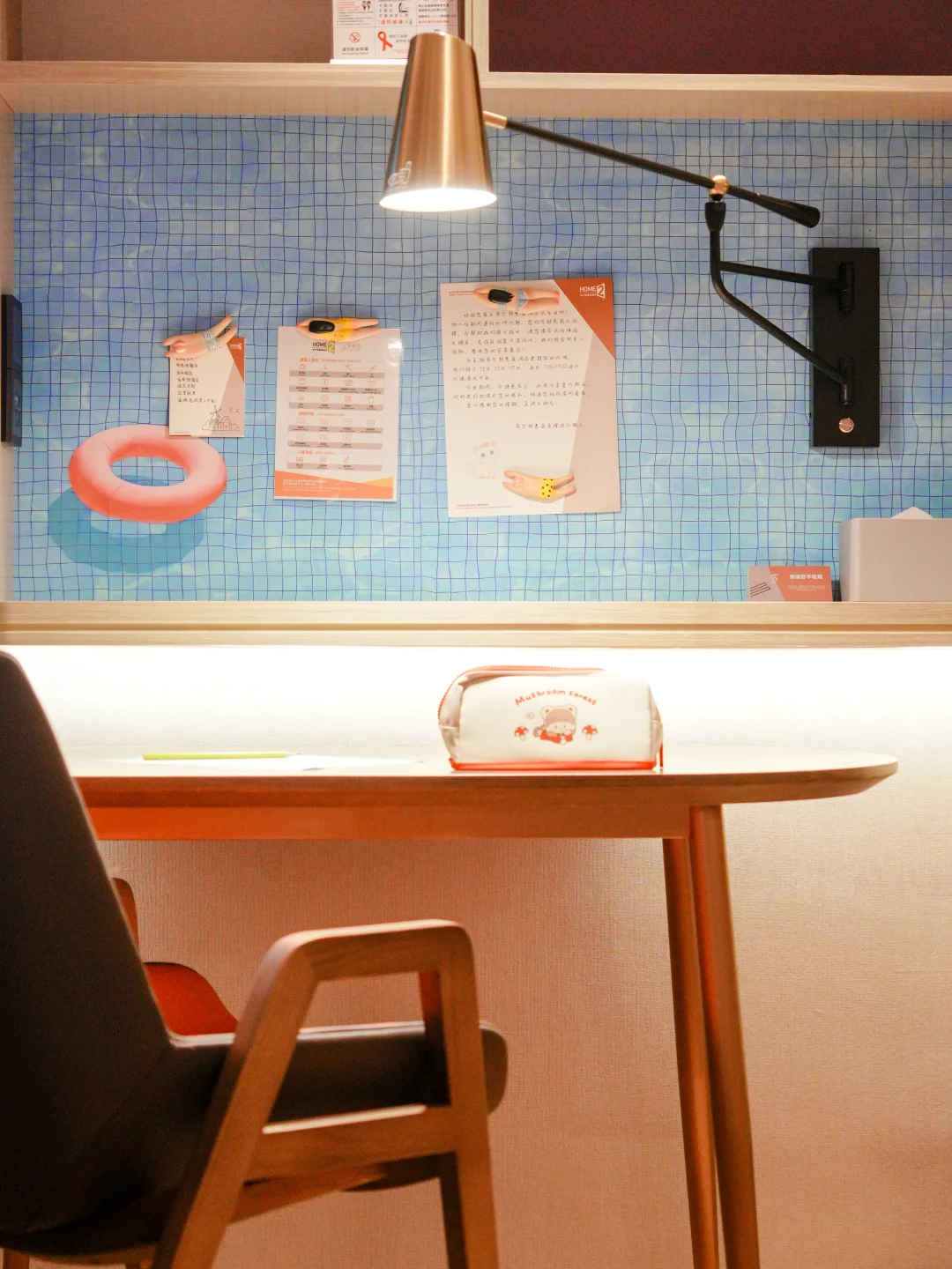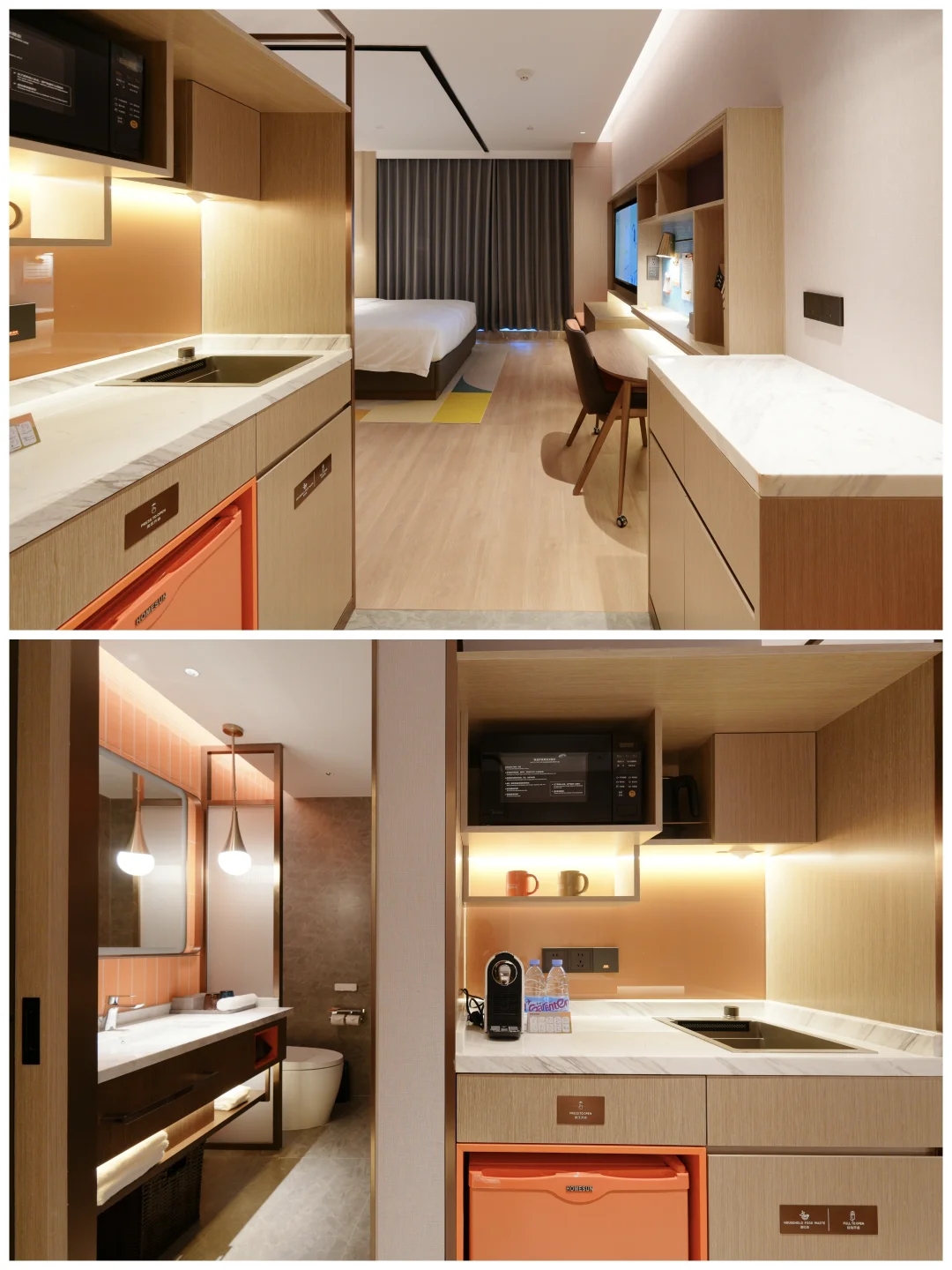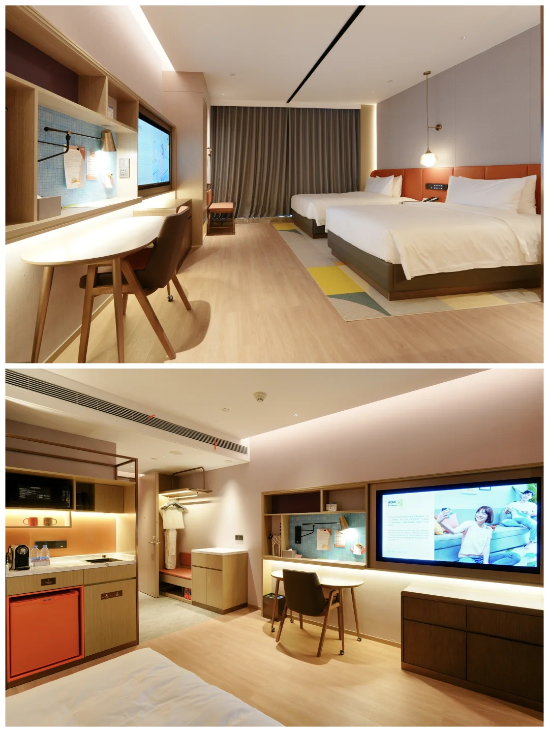 我订的是灵动双床房。推门进去就感觉空间布局很合理,每一处都利用得很好,房间色彩搭配才用了撞色设计,既有家的温暖,又让人心情愉悦