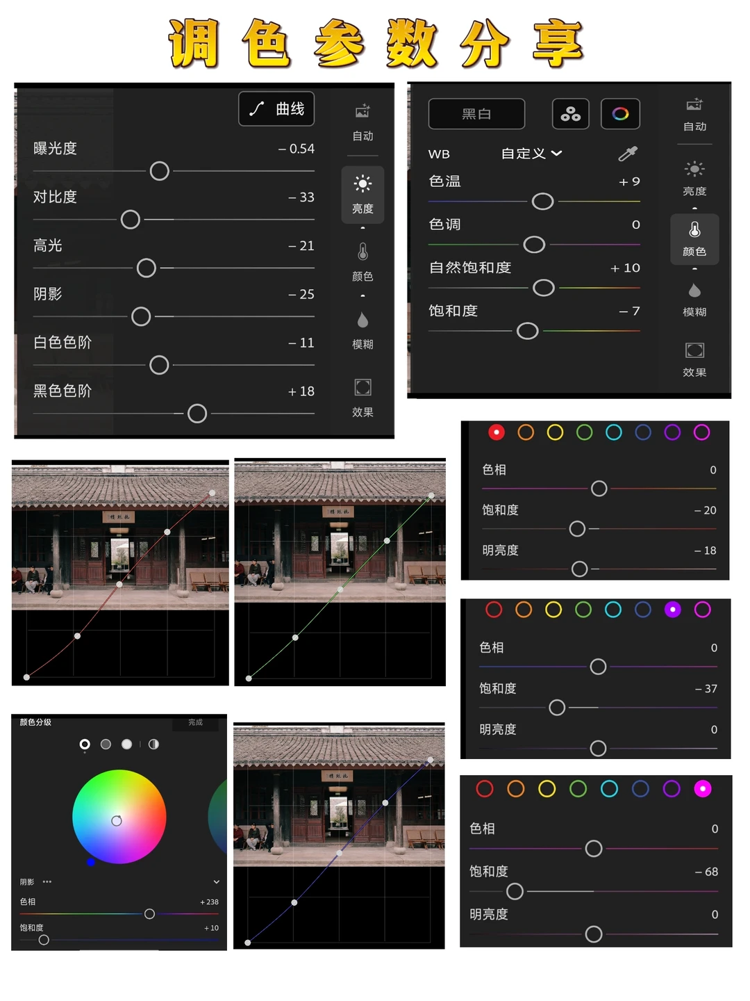 在此影调的基础上通过调节色调曲线让画面略微偏红一些,营造一种复古感!(针对古建筑效果特别好)