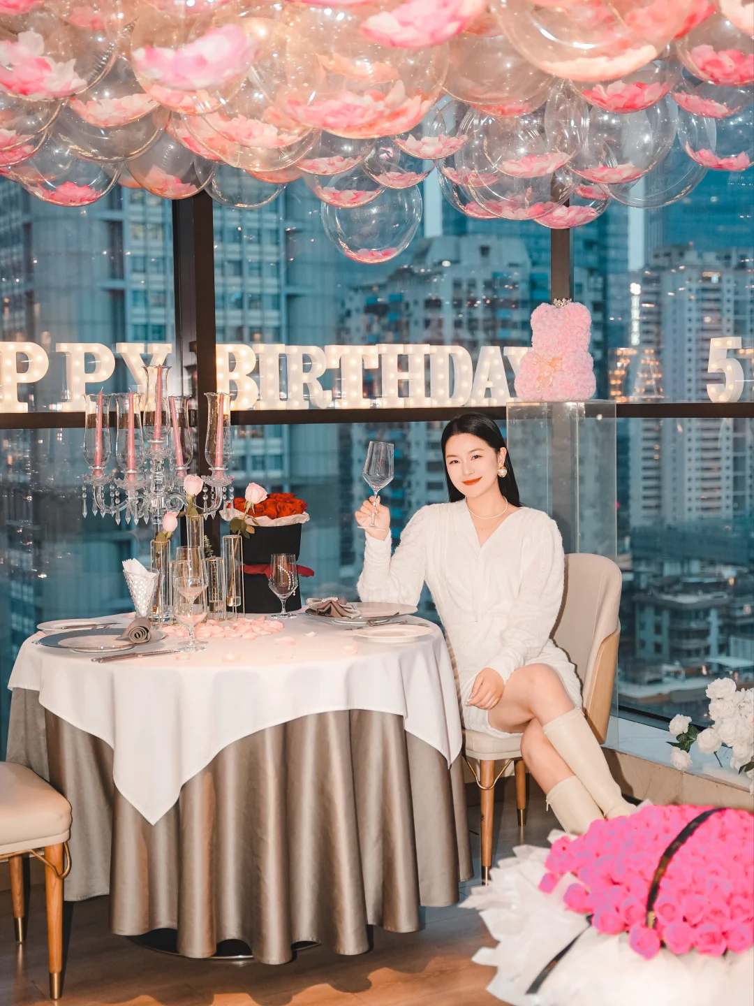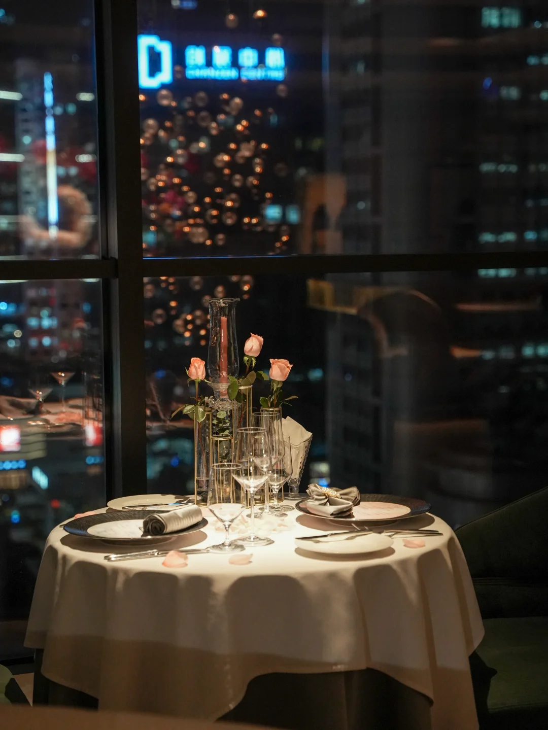 桌上烛光与远处霓虹温柔交织
