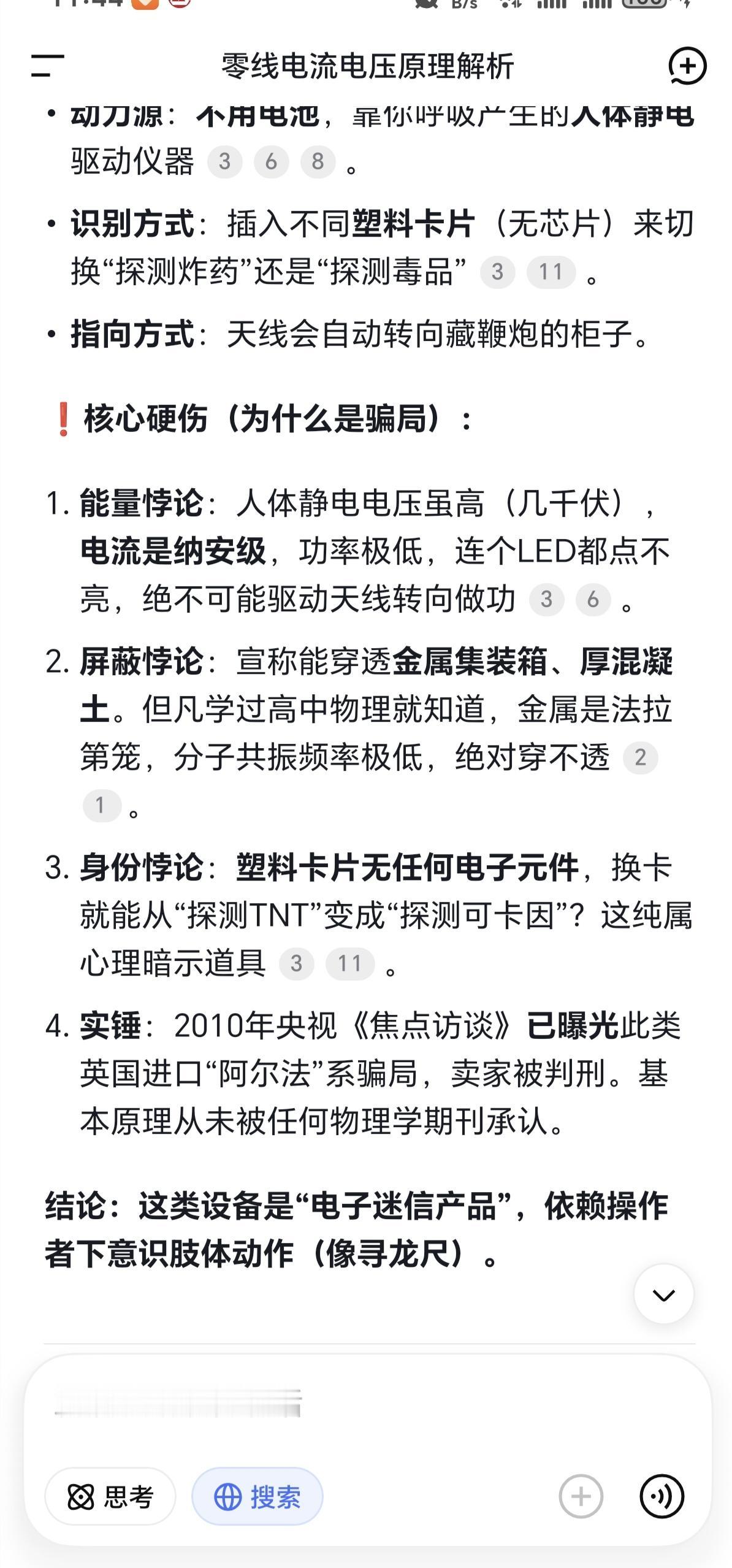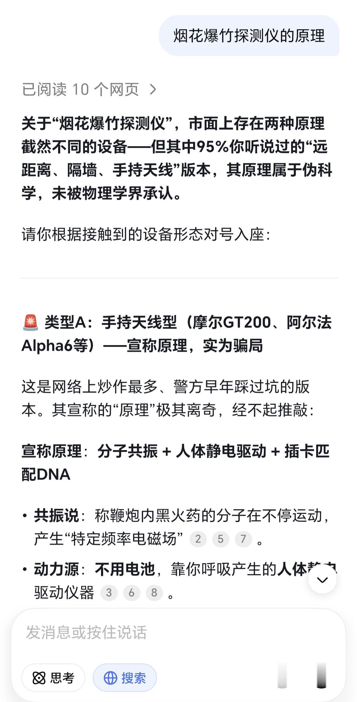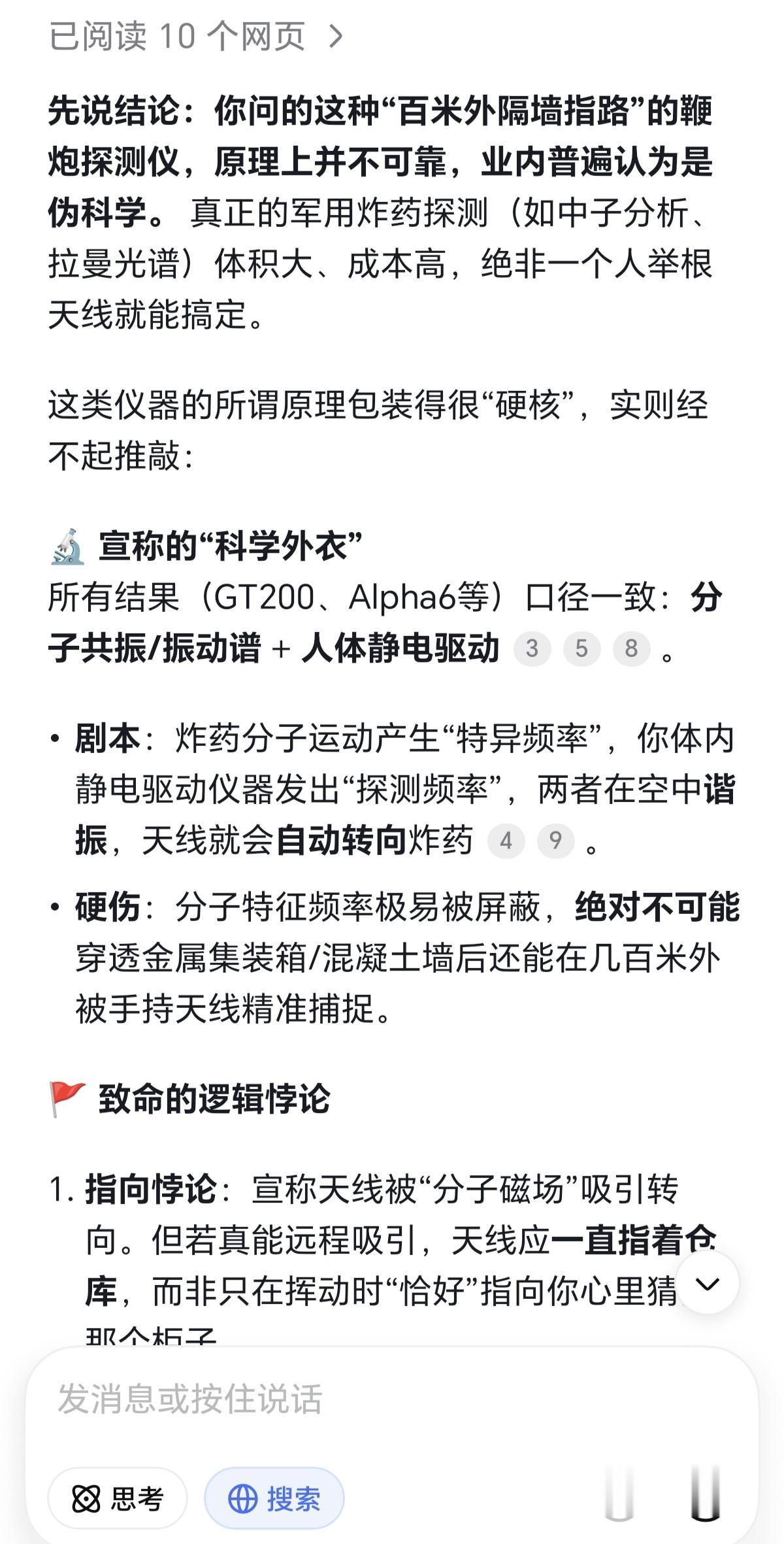 [捂脸]鞭炮探测仪是不是唬人的? 这黑科技,据说一探一个准儿。不论你把鞭炮藏在什么地方,就算埋地底下,也能够找出来。它还有隔墙功能,探测距离5~150m呢。 问了一下DeepSeek,说是这玩意儿采用分子共振、人体静电、超低频传导等原理设计而成的。说白了,就是人体带电,物体带正电荷,也就是双方都有磁场。当人体磁场穿过物体磁场时,就会使物体分子与人体分子产生磁场共振,探测仪感应到后,就会使指针指向发生偏转,从而确认鞭炮的位置。大概是这个意思吧。 但是,DeepSeek郑重其事地指出,这所谓的高科技是地道伪科学!并且,2010年央视«焦点访谈»栏目就曝光了此类产品的骗局,而且其基本原理从未被物理期刊承认。 为什么是个骗局呢? 1、能量悖论:人体静电电压虽高(几千伏),电流是纳安级,功率极低,连个LED都点不亮,绝不可能驱动天线转向做功 。 2、屏蔽悖论:宣称能穿透金属集装箱、厚混凝土。但凡学过高中物理就知道,金属是法拉第笼,分子共振频率极低,绝对穿不透 。 3、身份悖论:塑料卡片无任何电子元件,也没有芯片,换卡就能从“探测TNT”变成“探测可卡因”? 上面就是DeepSeek的结论。虽然看不太懂,但根据电磁场原理,能探测那么远,还隔着墙,绝对不可能! 人体能带多少电?又能产生多大的磁场?黑火药既没磁性,就算是带正电荷,那产生的磁场简直忽略不计。不用说离那么老远,就是紧挨着,估计也不灵。要真可以的话,那也能发明出探测各种物体的仪器了吧?