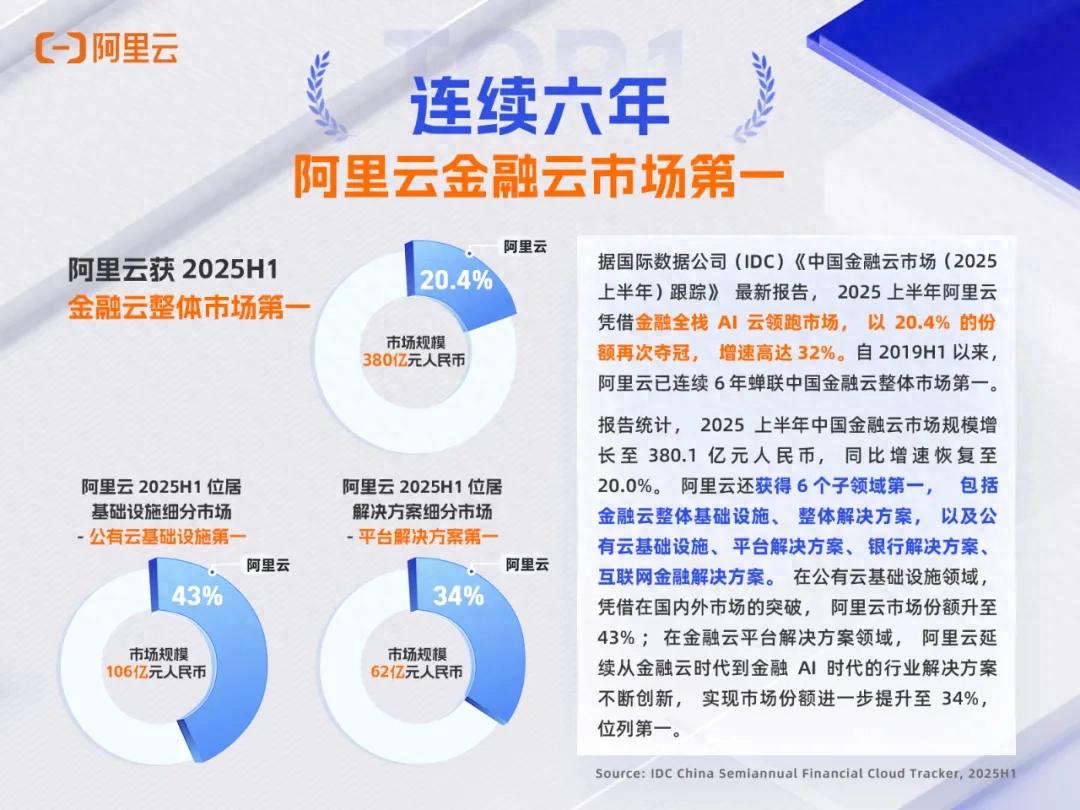 近日,据国际数据公司(IDC)《中国金融云市场(2025 上半年)跟踪》最新报告,2025 上半年阿里云凭借金融全栈 AI 云领跑市场,以 20.4% 的份额再次夺冠,收入 77.5 亿,增速高达 32%。