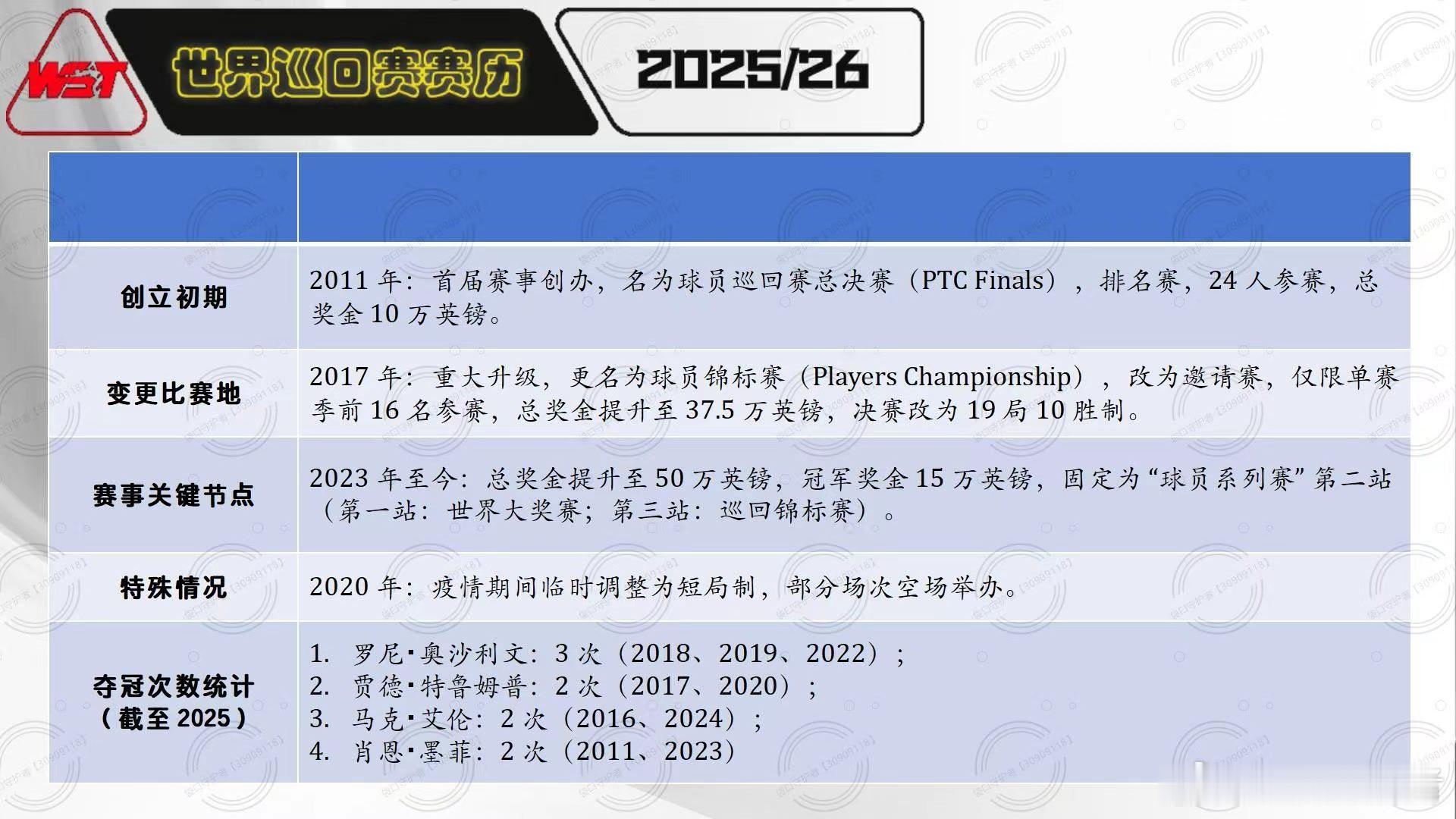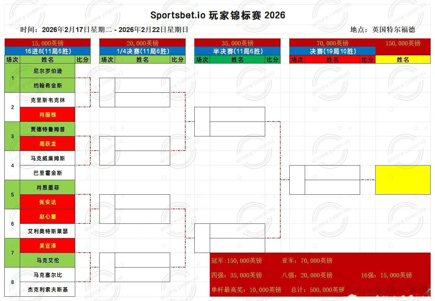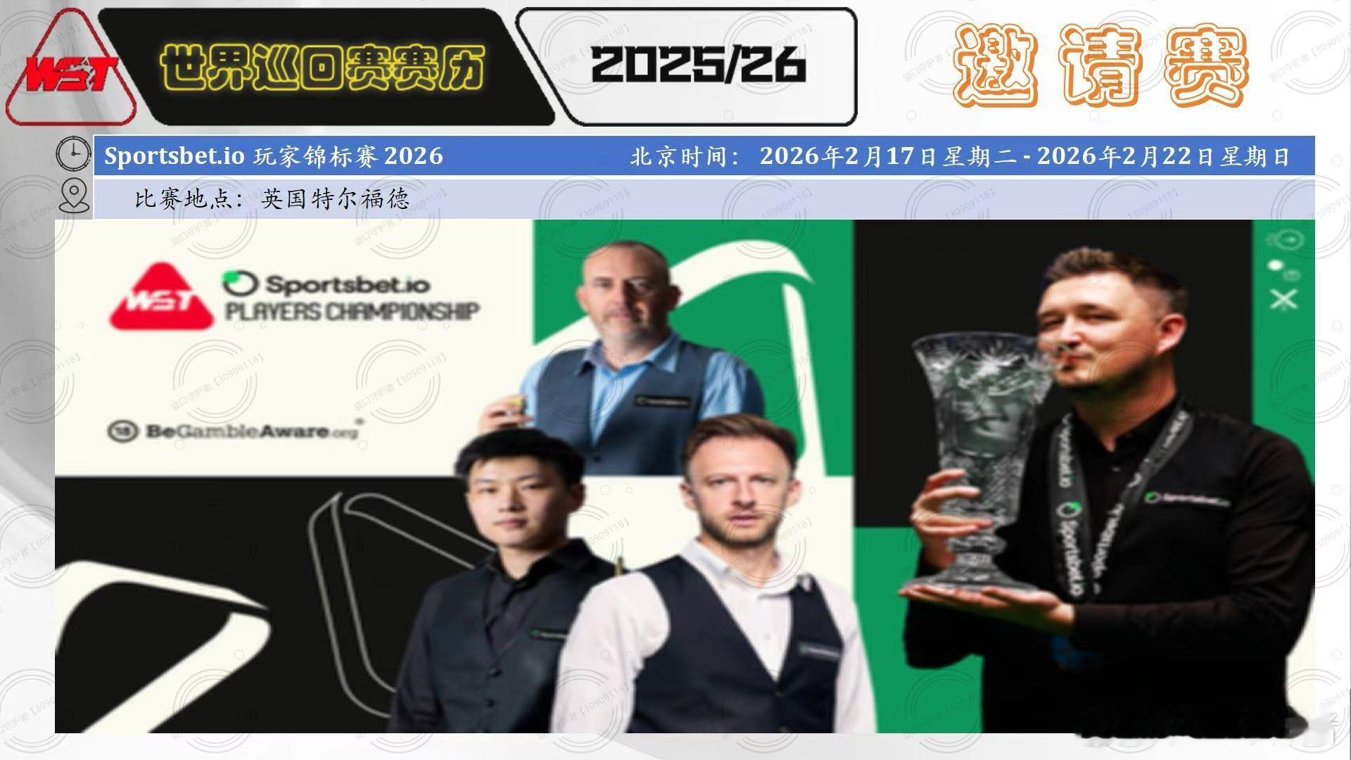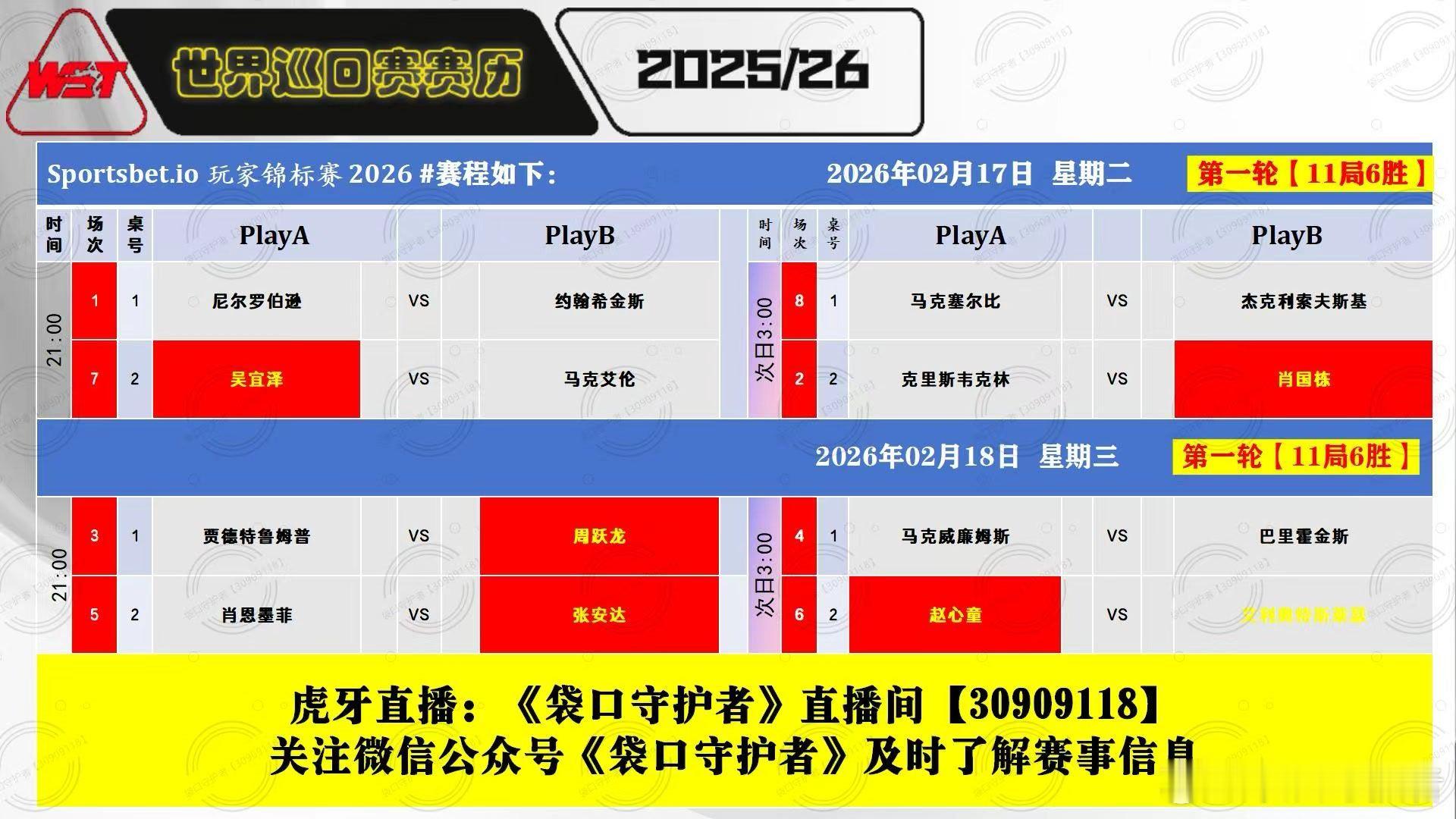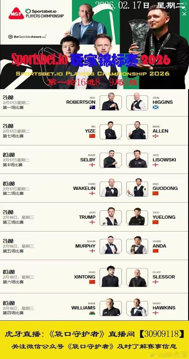 2026斯诺克球员锦标赛赛 第一天 第一轮球员锦标赛仅限于本赛季排名前16球员参赛的邀请赛2026.02.17日 星期二 21:00 直播:吴宜泽VS马克艾伦2026.02.18日 星期三3:00 直播:肖国栋VS克里斯韦克林 小窗:周跃龙VS贾德特鲁姆普