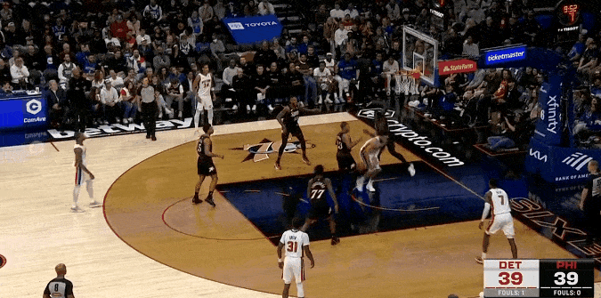 NBA常规赛,76人对阵活塞的比赛正在进行中。