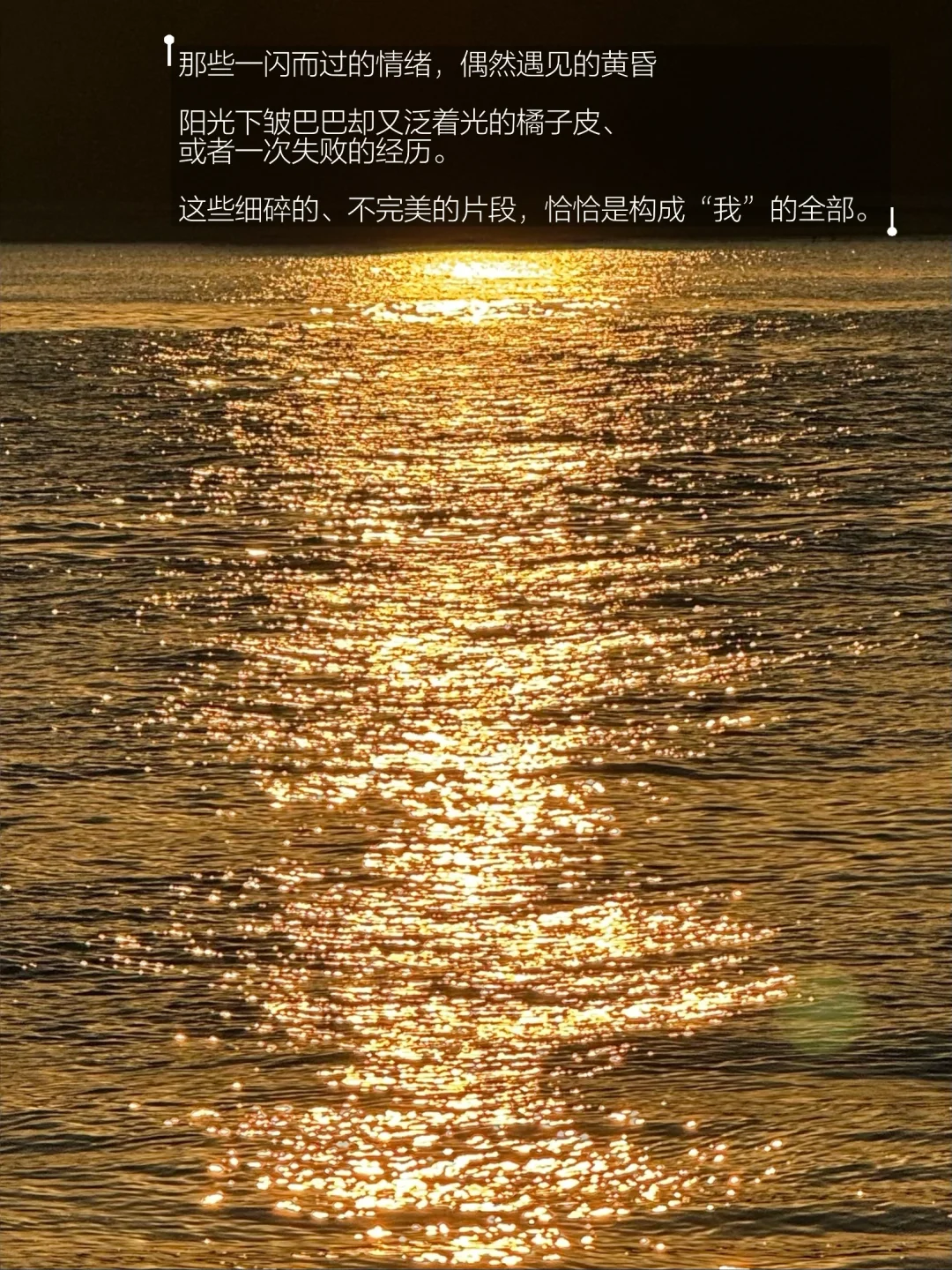 阳光下皱巴巴却又泛着光的橘子皮、或者一次失败的经历。这些细碎的、不完美的片段,恰恰是构成“我”的全部。