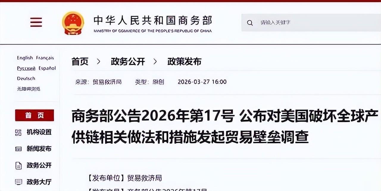 结果呢,话音刚落,第二天也就是3月27日,中国商务部就正式发布了两个公告,宣布启动针对美国的贸易壁垒调查。这次调查直接回应了美国贸易代表办公室此前以产能过剩和强迫劳动等理由发起的两项301调查程序。中国方面的公告明确指向美国在全球生产供应链稳定和绿色产品贸易自由化方面的做法,决定采取对等措施来维护自身产业利益。