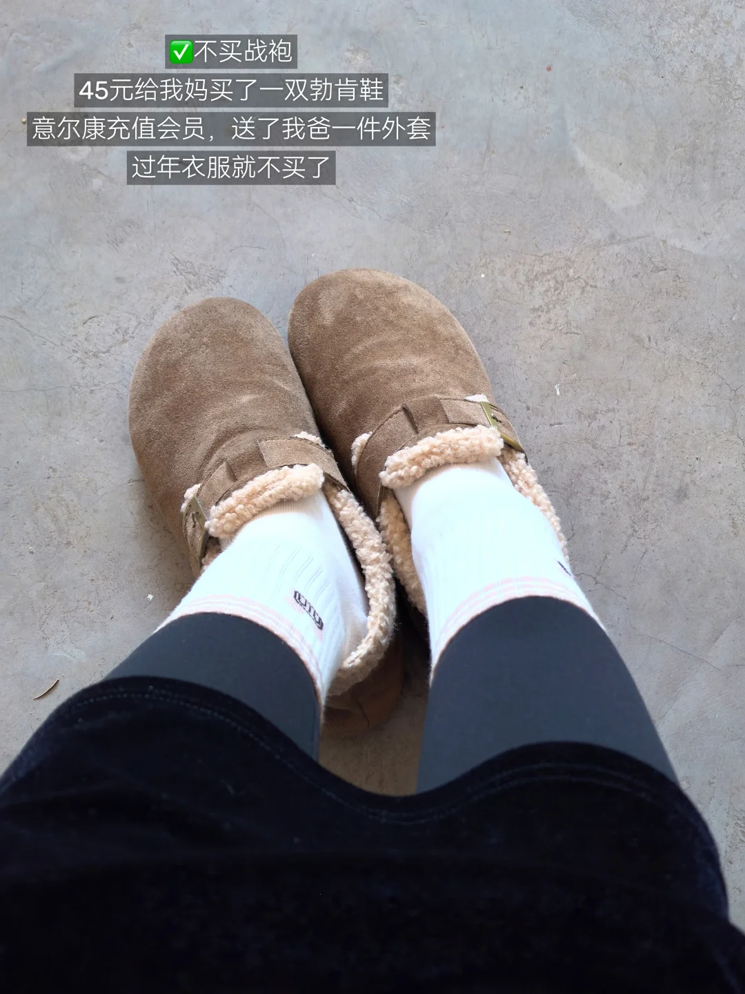 以前过年回家,我会给我爸妈从头到脚买一身。今年我在意尔康充了700元会员,送了我爸一件薄款羽绒服。给我妈买了一双博肯鞋45元,这个就是过年战袍。