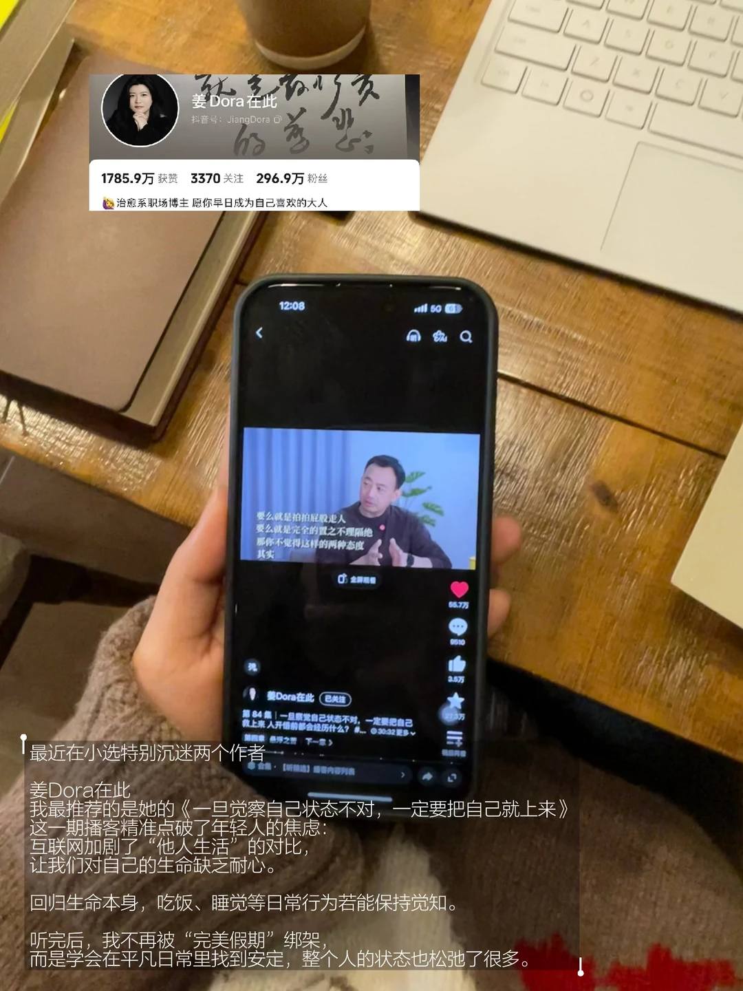 我最推荐的是她的《一旦觉察自己状态不对,一定要把自己就上来》,这一期播客精准点破了年轻人的焦虑:互联网加剧了“他人生活”的对比,让我们对自己的生命缺乏耐心。回归生命本身,吃饭、睡觉等日常行为若能保持觉知。听完姜Dora的博客后,我不再被“完美假期”绑架,而是学会在平凡日常里找到安定,整个人的状态也松弛了很多。