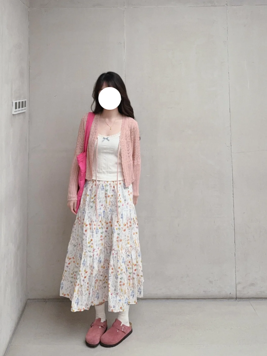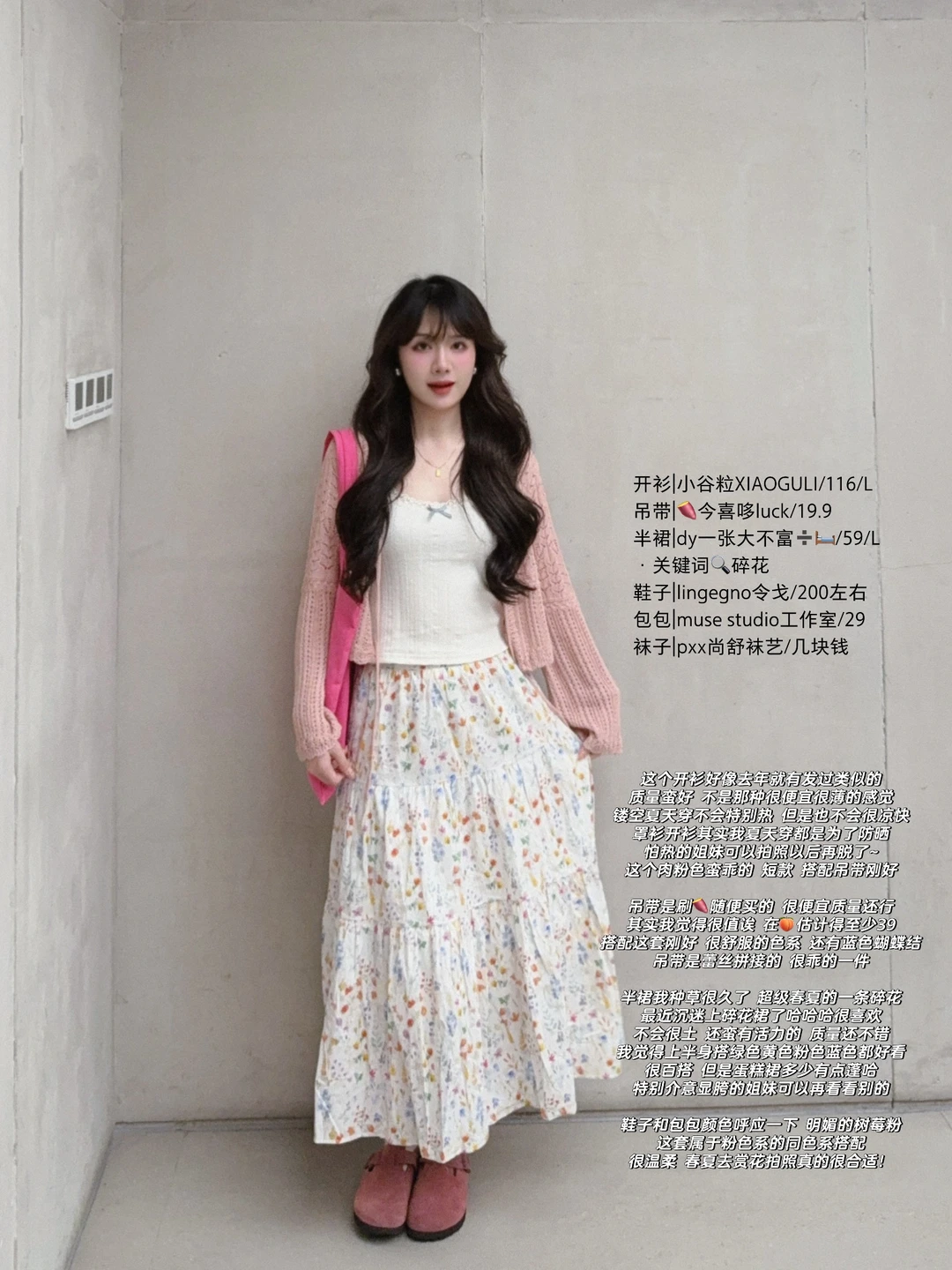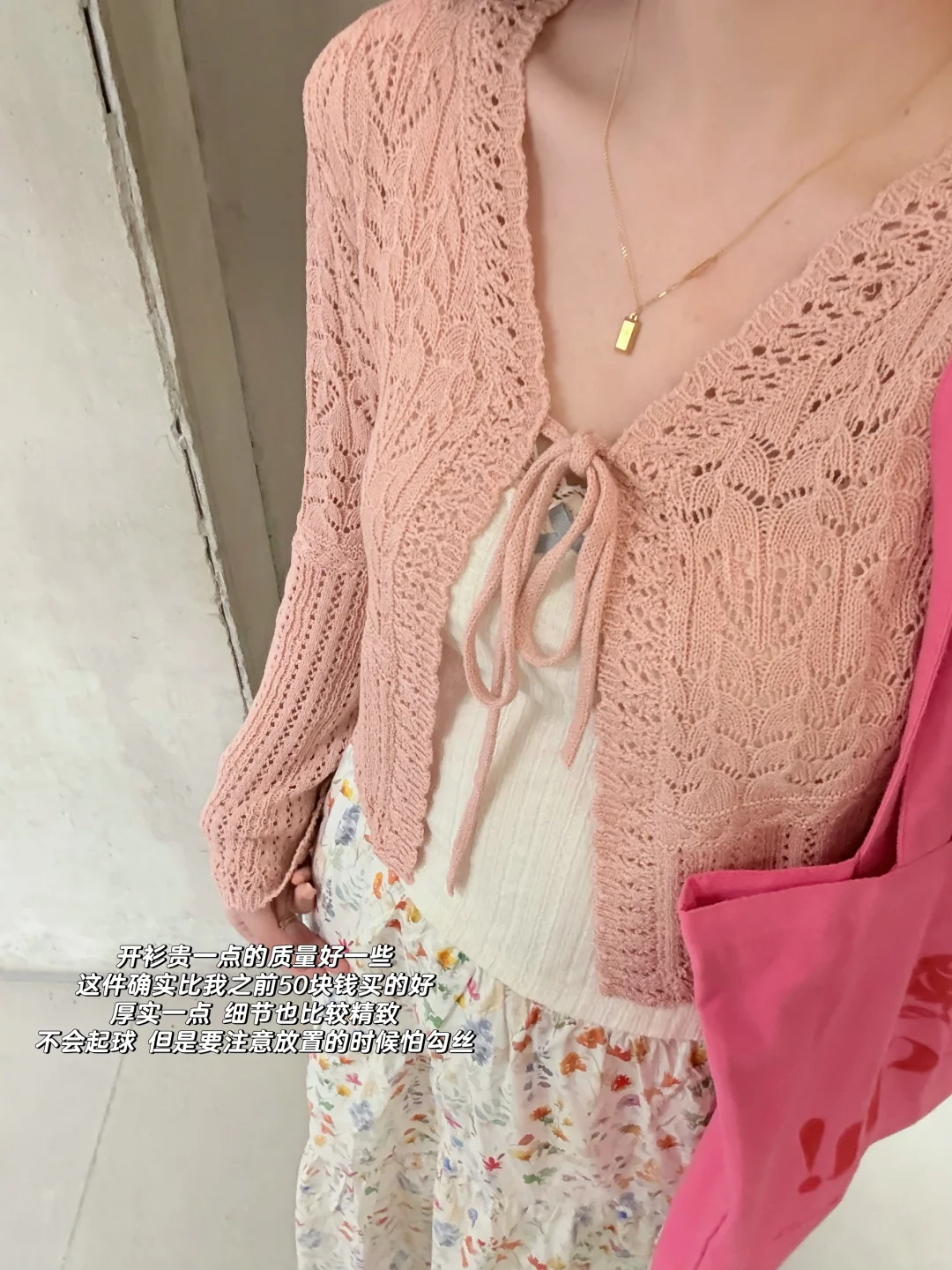 这件开衫的肉粉色内搭选择米白色比白色更出彩