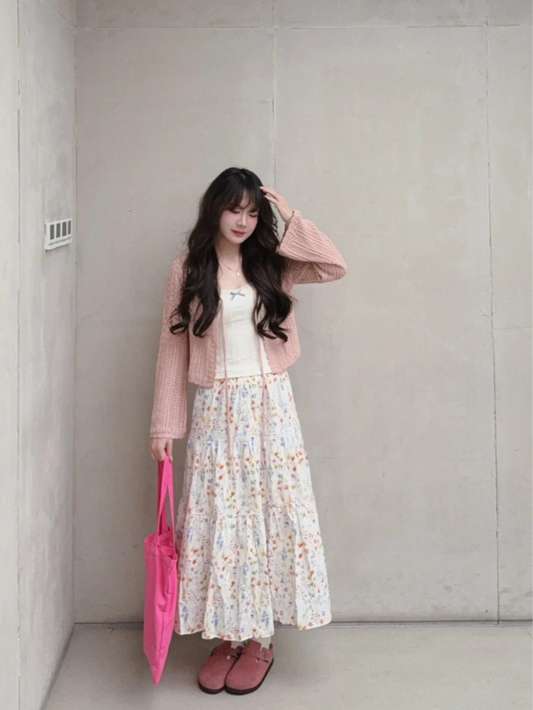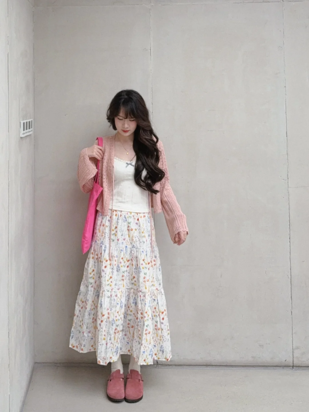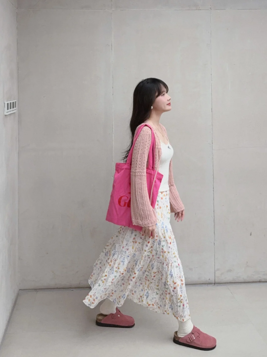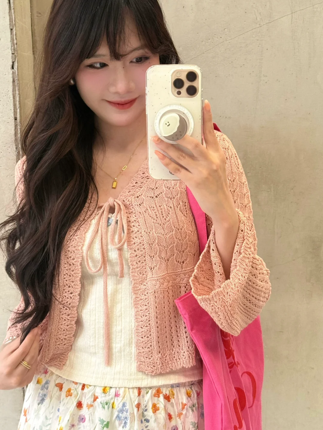 这件开衫的肉粉色内搭选择米白色比白色更出彩