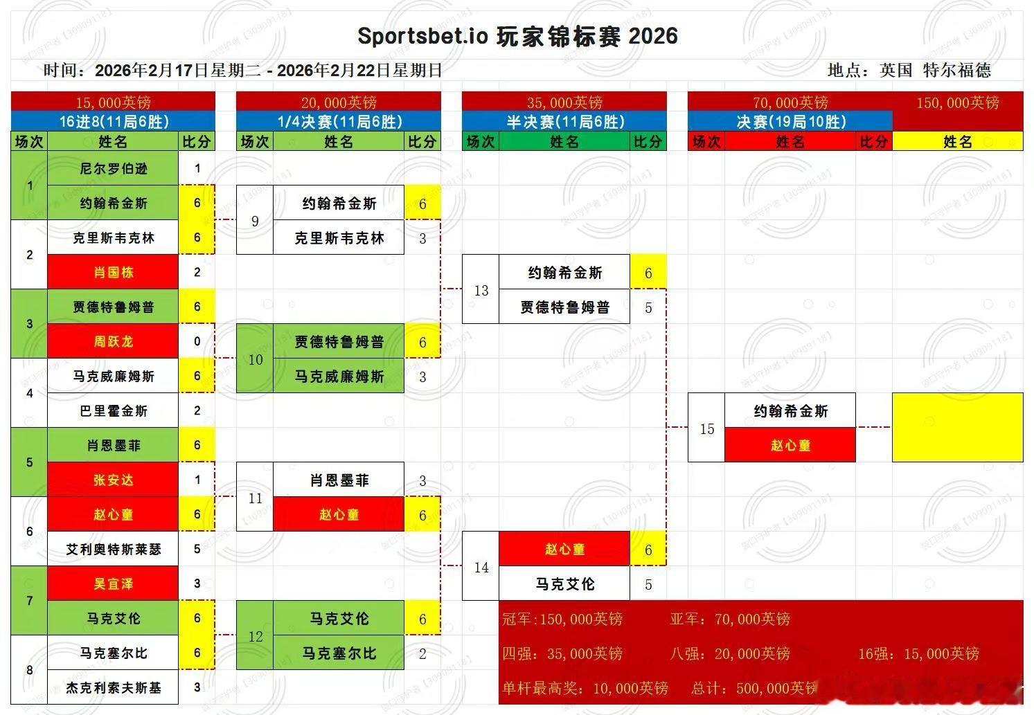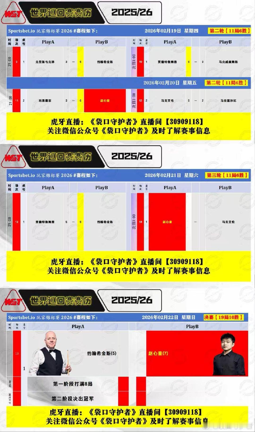 2026斯诺克球员锦标赛赛 第五天2026.02.22日 星期日 决赛 :约翰希金斯VS赵心童第一阶段 21:00 打满8局2026.02.23日 星期一第二阶段 3:00 决出冠军