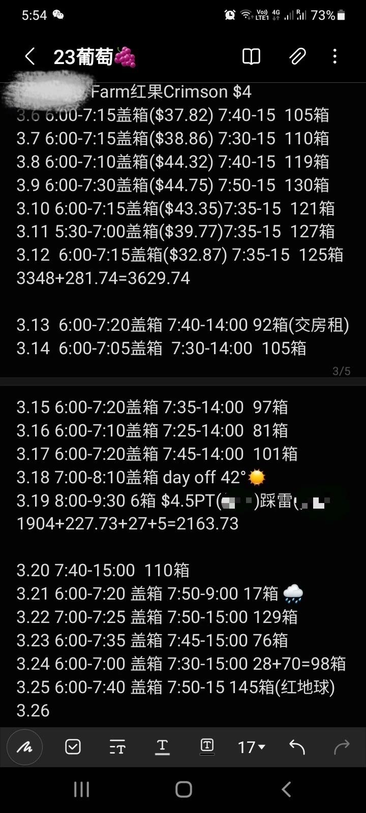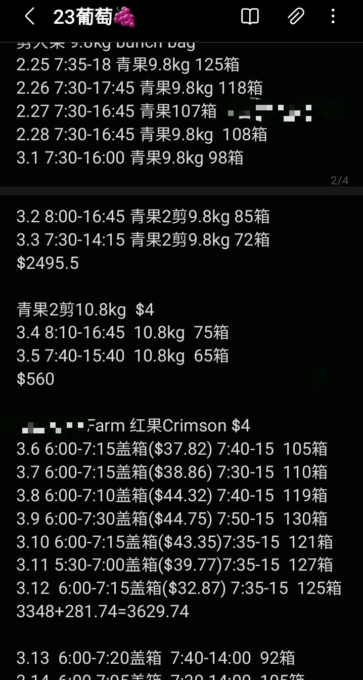 [二R]M村葡萄季从12月末到4-5月份,任何水果都不可能稳定的一直赚钱,每种水果情况也不一样,葡萄一般早期和晚期难赚钱,早期甜度不够,工时不多,晚期烂果多,修果时间长!中期最好赚
