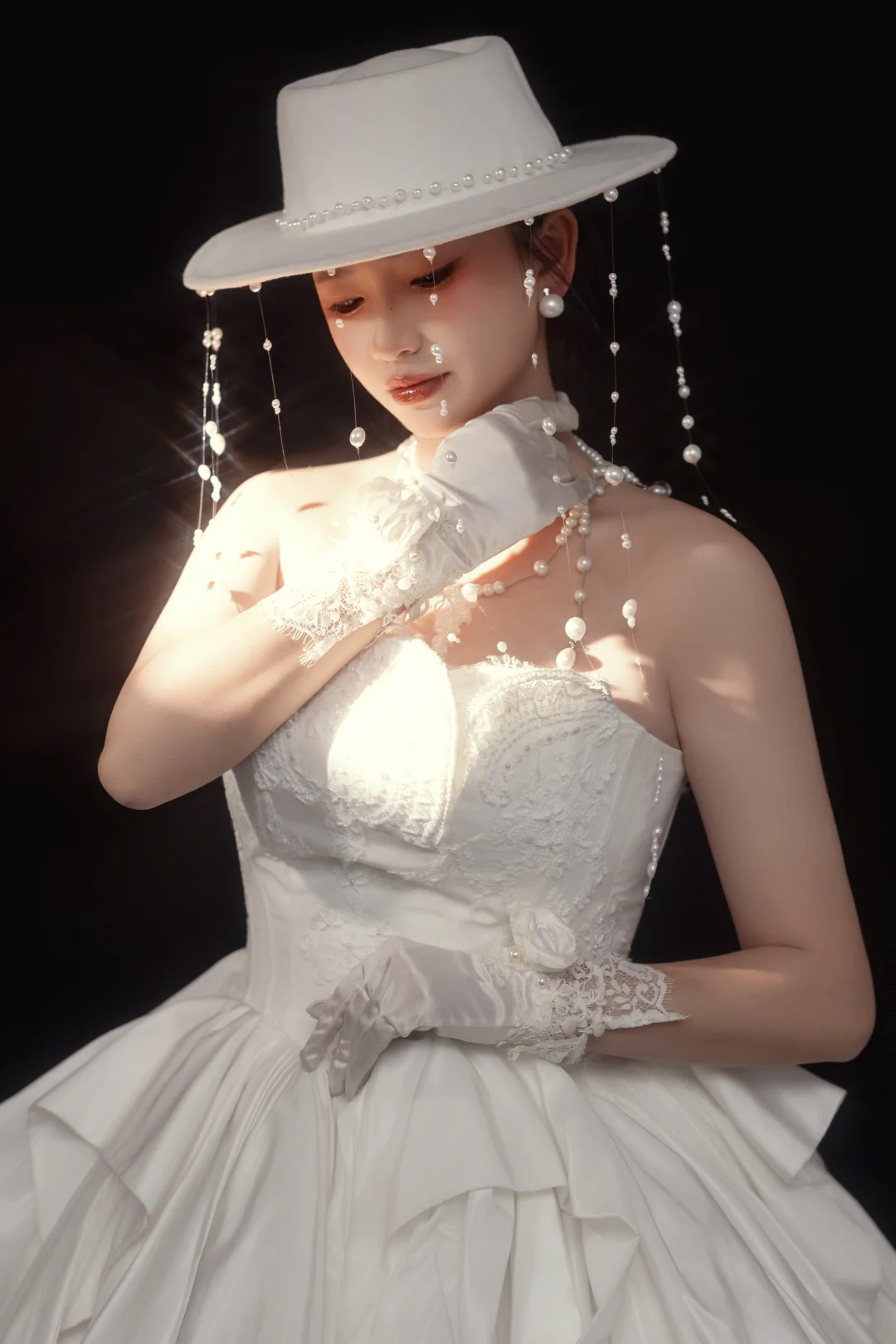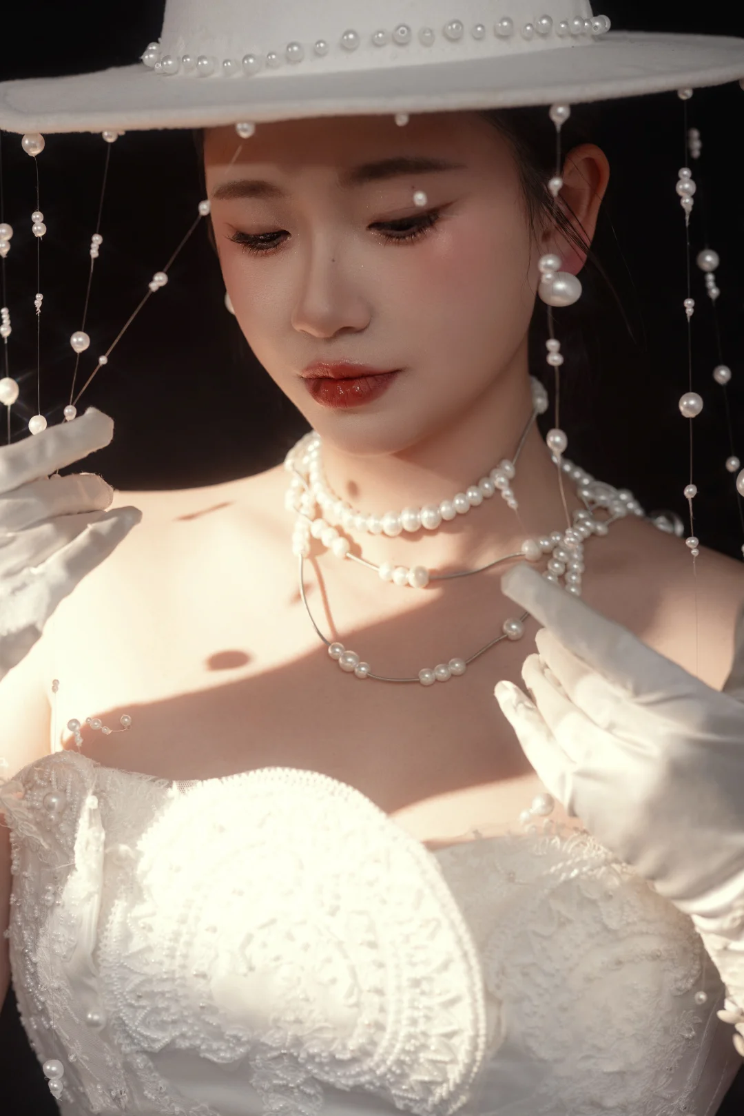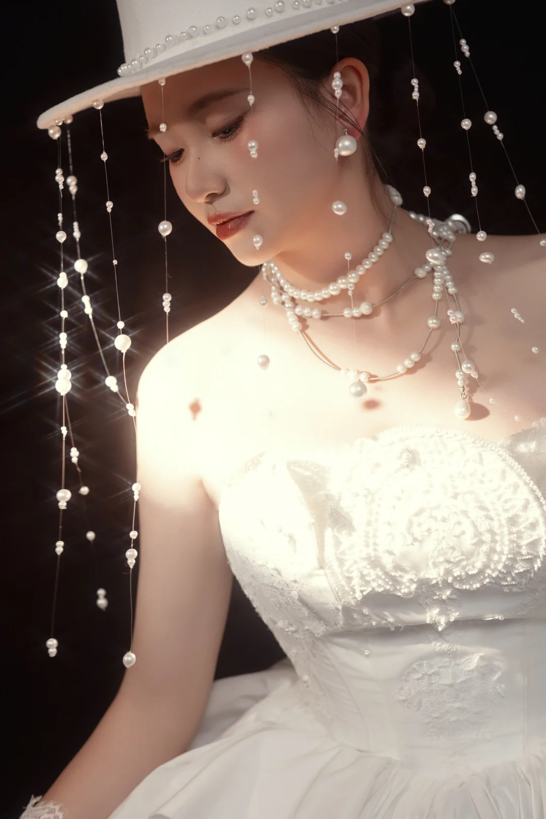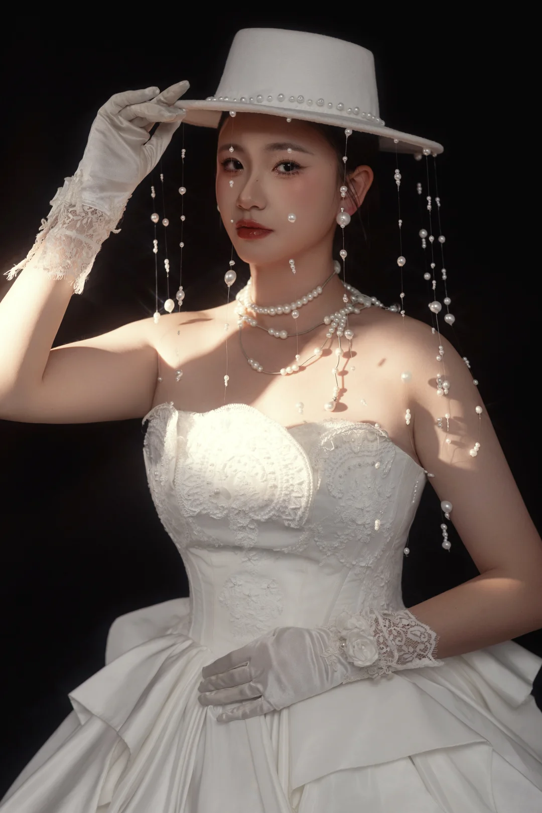 这组珍珠礼帽婚纱写真,我直接封神了❤️ • 珍珠礼帽+流苏设计,自带复古滤镜,又A又仙 • 多层珍珠项链+蕾丝手套,细节拉满,高级感爆棚 • 缎面大拖尾婚纱,褶皱设计超有质感,气场全开 • 光影打在身上,像从旧时光里走出来的贵族小姐,氛围感直接拉满 成片出来的时候,我真的被自己美到了!完全不挑人,黄皮也能轻松驾驭,个人写真很备婚的姐妹都可以冲!
