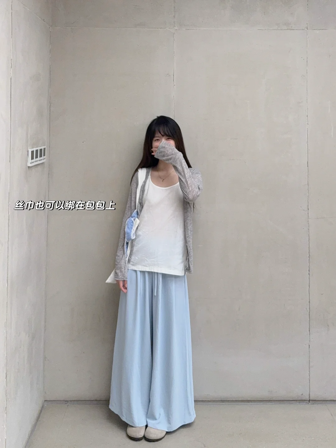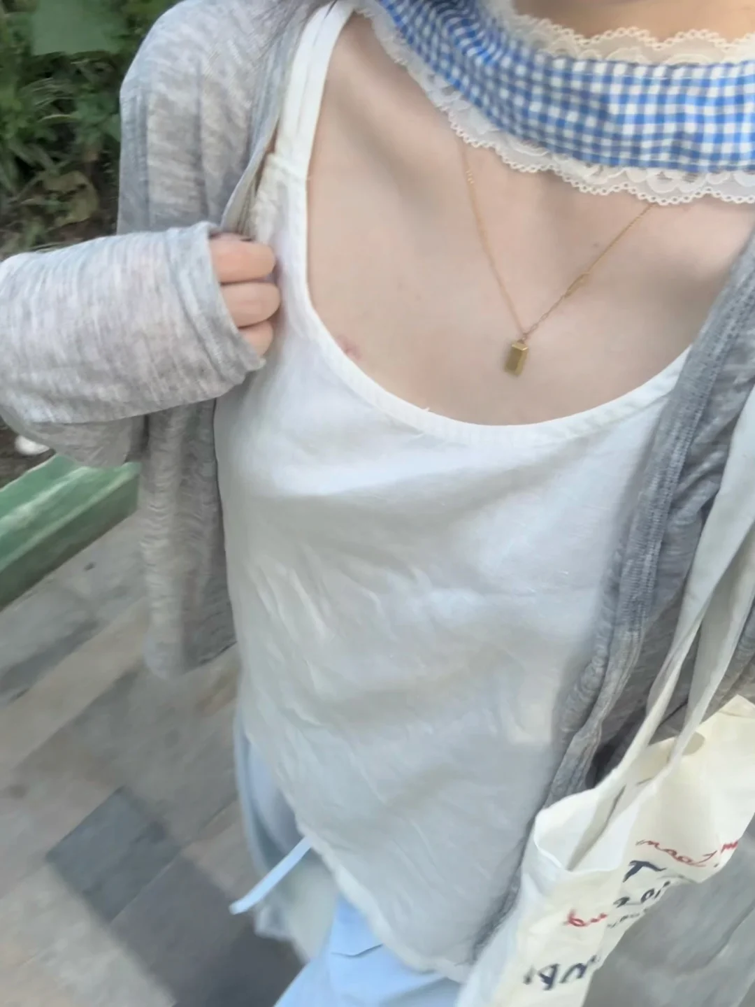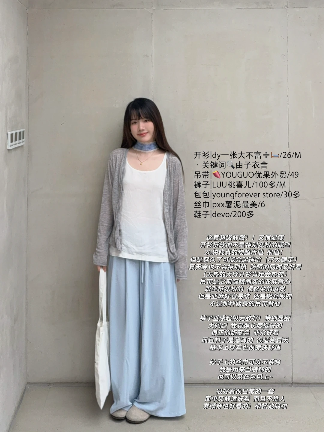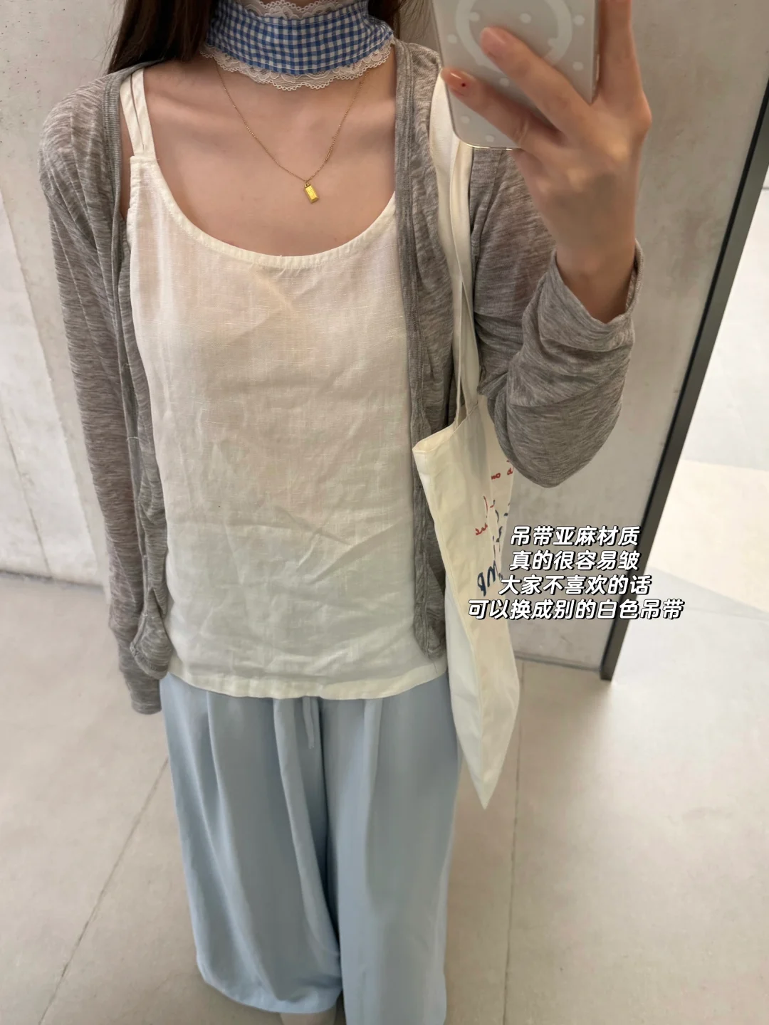 开衫➕背心 我觉得虽然室外有点热但是确实很防晒而且很遮肉显瘦 在室内空调房又很舒适